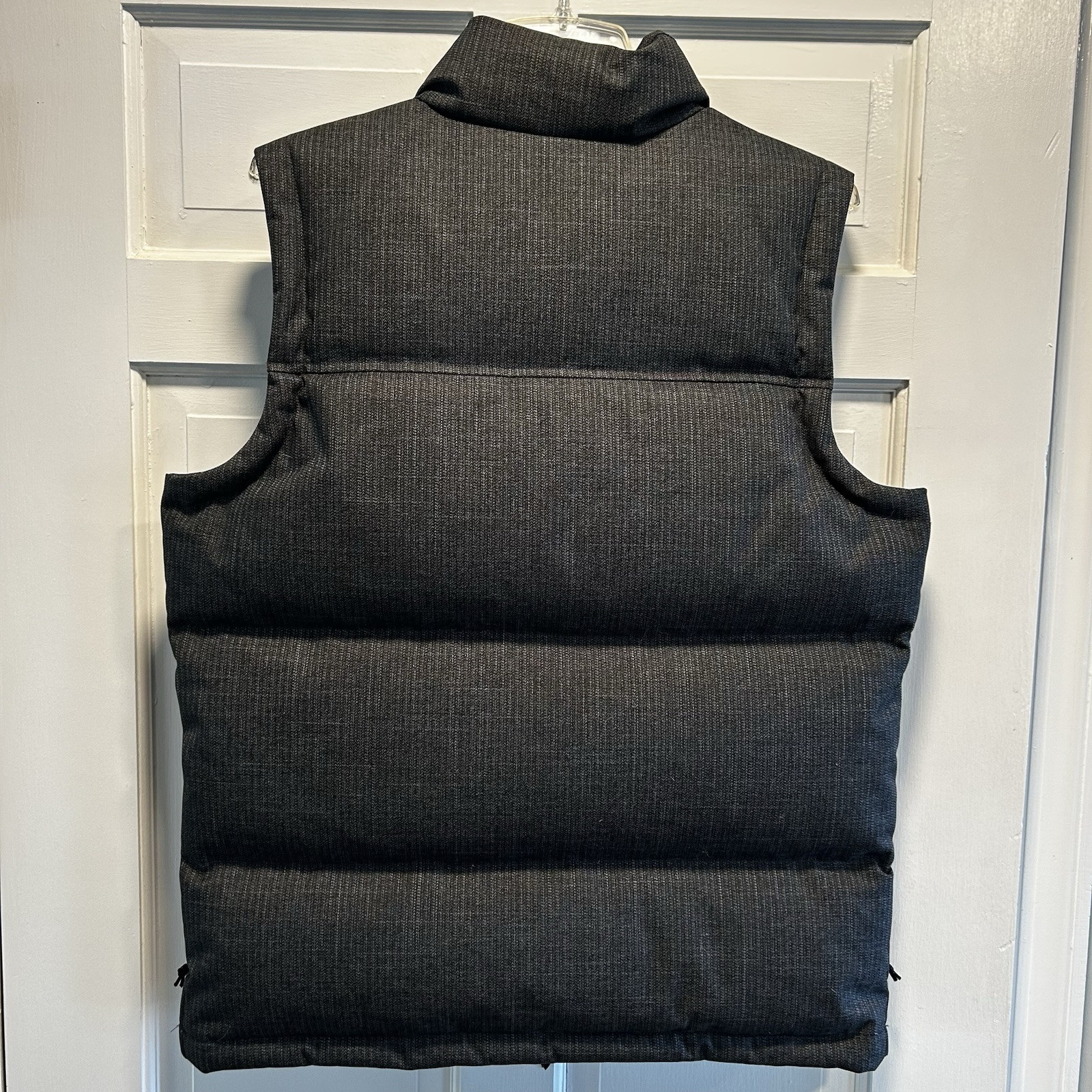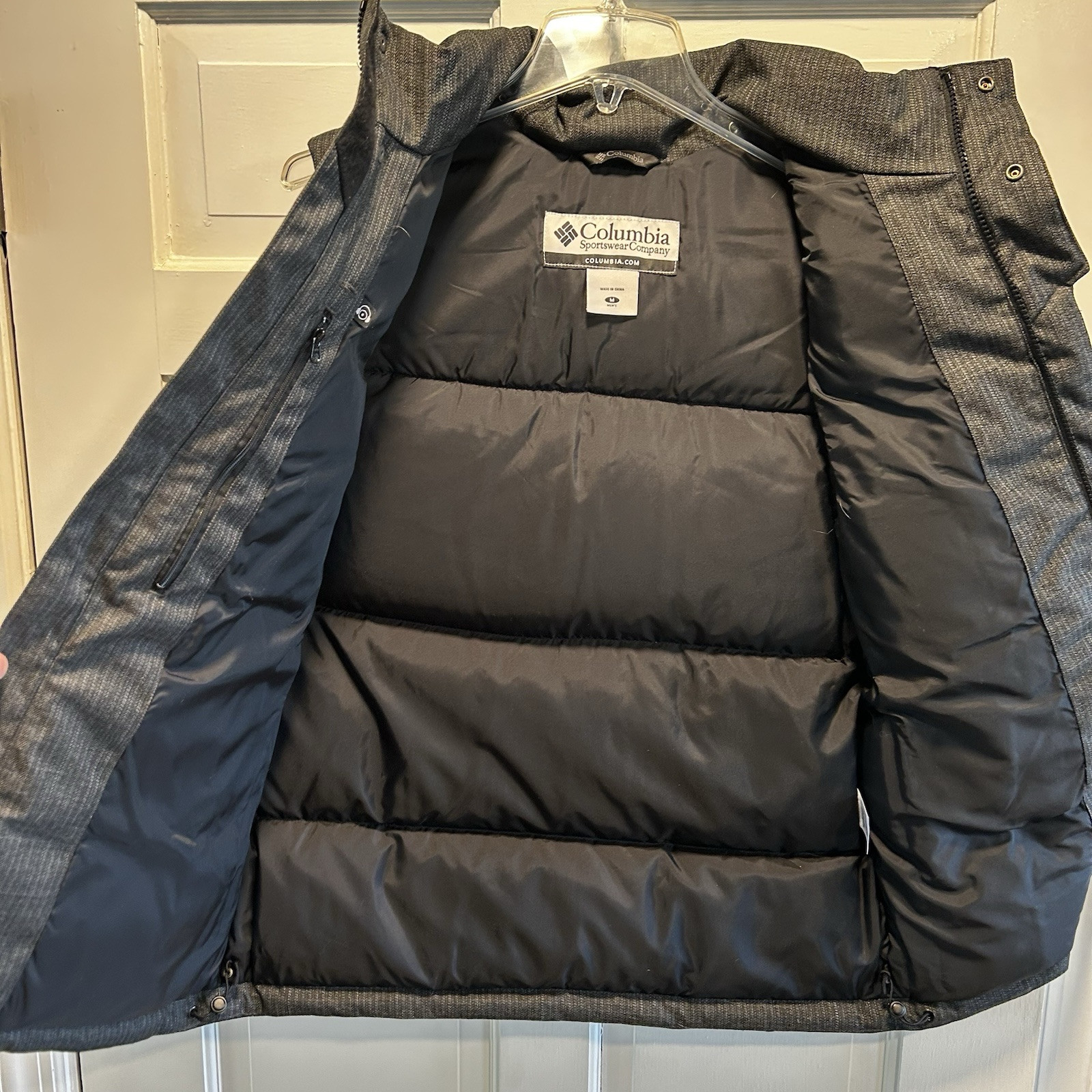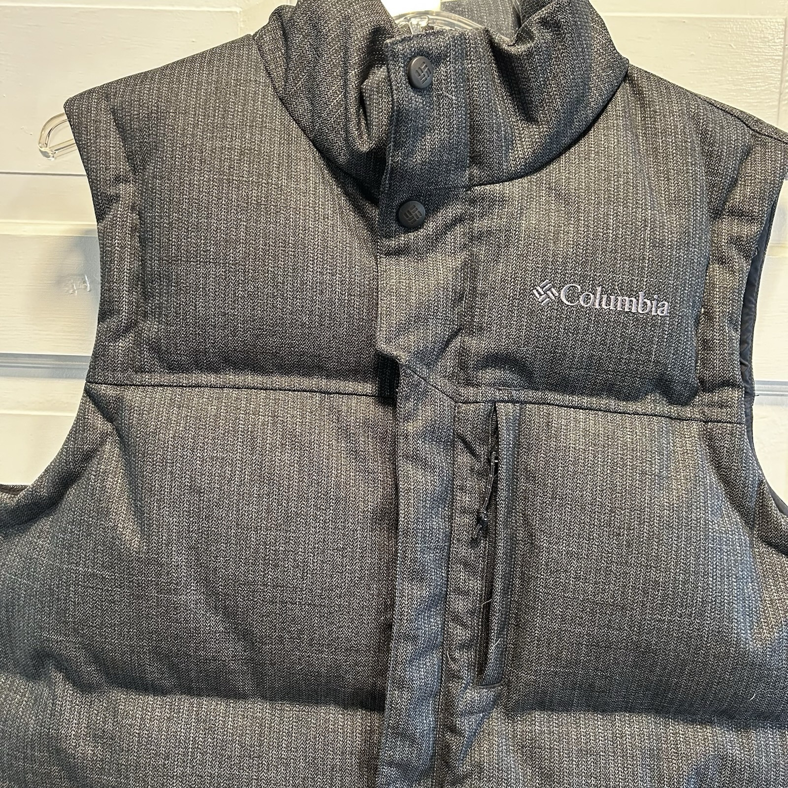 Embrace the chill in this Columbia Dark Gray Puffer Jacket, designed to keep you warm and stylish. This jacket is a must-have for any fashion-forward individual looking for a functional yet trendy piece. Crafted with high-quality polyester, this regular fit jacket is perfect for men who value comfort and durability. The jacket features a sleek and modern puffer style, making it an ideal addition to any wardrobe. This jacket is perfect for layering during those cold winter months. The gray color is versatile and easy to pair with any outfit, while the Columbia brand ensures quality and long-lasting wear. Don't miss out on this must-have piece! Three zipper pockets on front; one zipper pocket inside. This is a good looking vest. Has an almost tweed look to the outer shell.