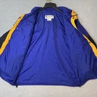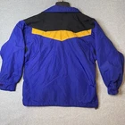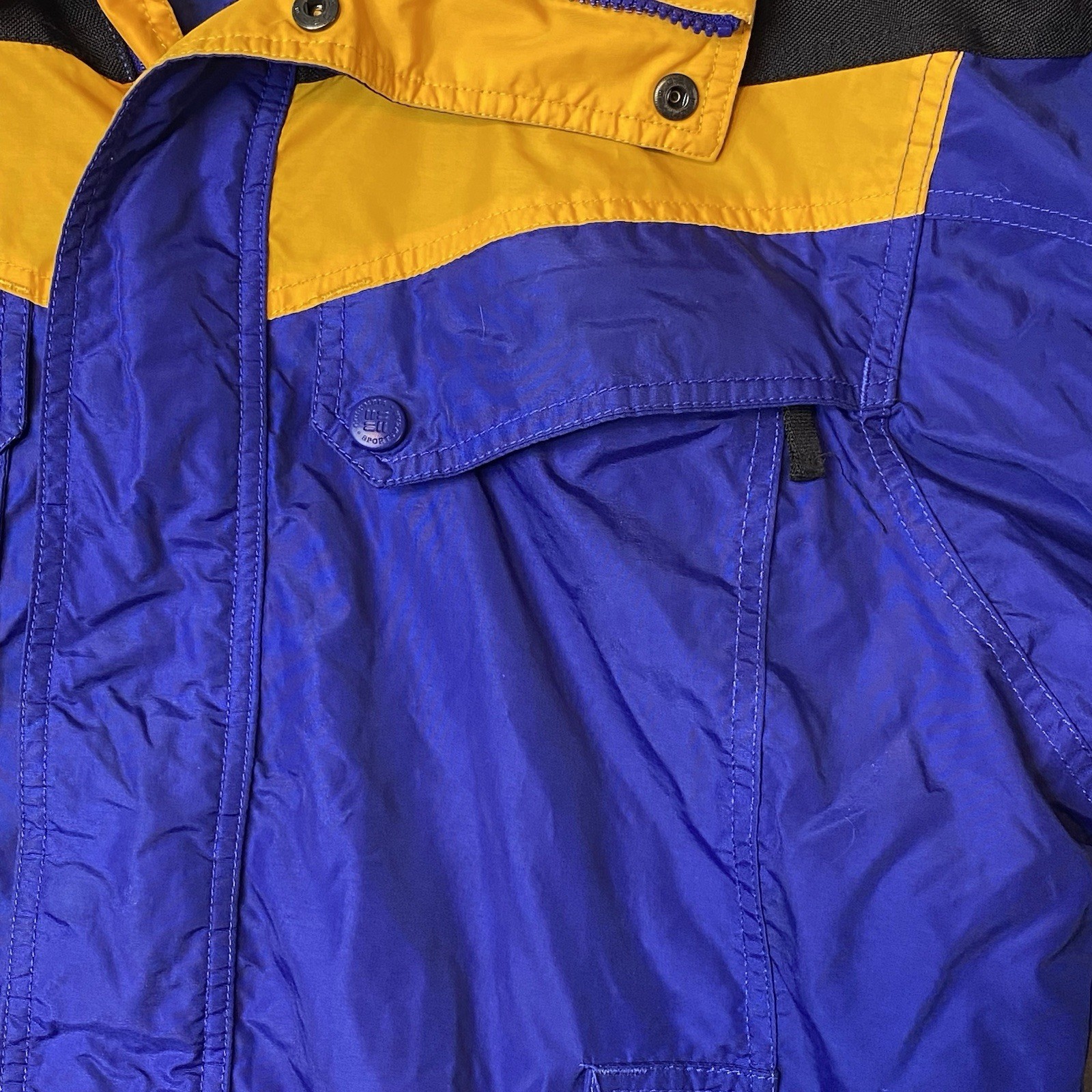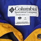 This Columbia Jacket is perfect for outdoor activities like hiking. The blue and yellow colored jacket features a full zip closure with a button accent and a stand-up collar style. It is made of softshell nylon material and has a nylon lining with polyester insulation, making it suitable for winter, fall, and spring seasons. The mid-length parka style jacket comes in a regular fit and size type, with a hooded feature for added protection against the elements. It is machine washable and has a vintage look. The Columbia logo accents the jacket, giving it a unique touch. This jacket is great for travel and casual occasions.