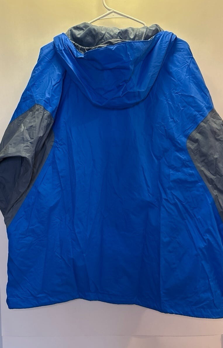Columbia, rain jacket, men’s extra large, blue and gray, has a zipper and button front front zipper pockets. Attached hood mesh inside liner overall great condition smoke free, pet friendly home no stains or holes has Omni tech waterproof, and breathable technology no arm vents. Bin: D51 coats/jackets