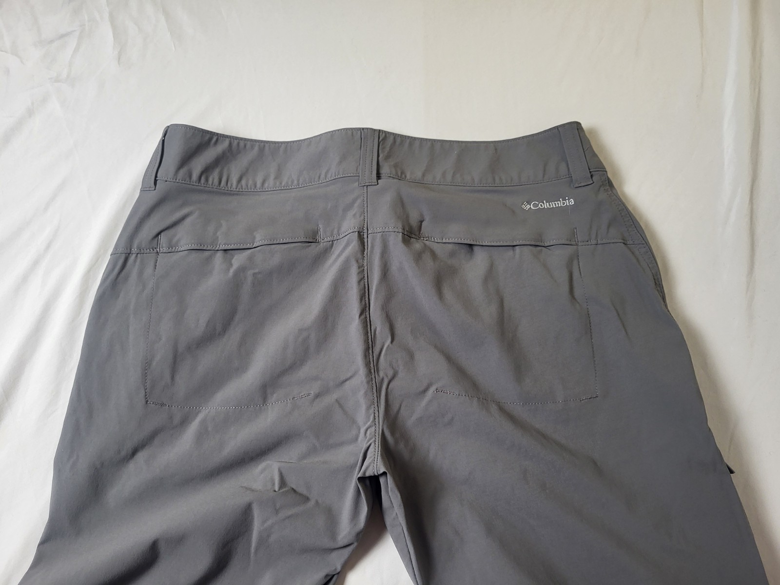 The product is a pair of Columbia Size 10 Grey Convertible Roll-Up Hiking Pants. These lightweight pants are perfect for travel and casual occasions, with a flattering straight leg style and flat front design. Made of nylon, they are machine washable for easy care. The versatile gray color and lightweight feature make them ideal for summer, fall, and spring seasons. The convertible roll-up design adds functionality to these practical and stylish pants by Columbia. #0173