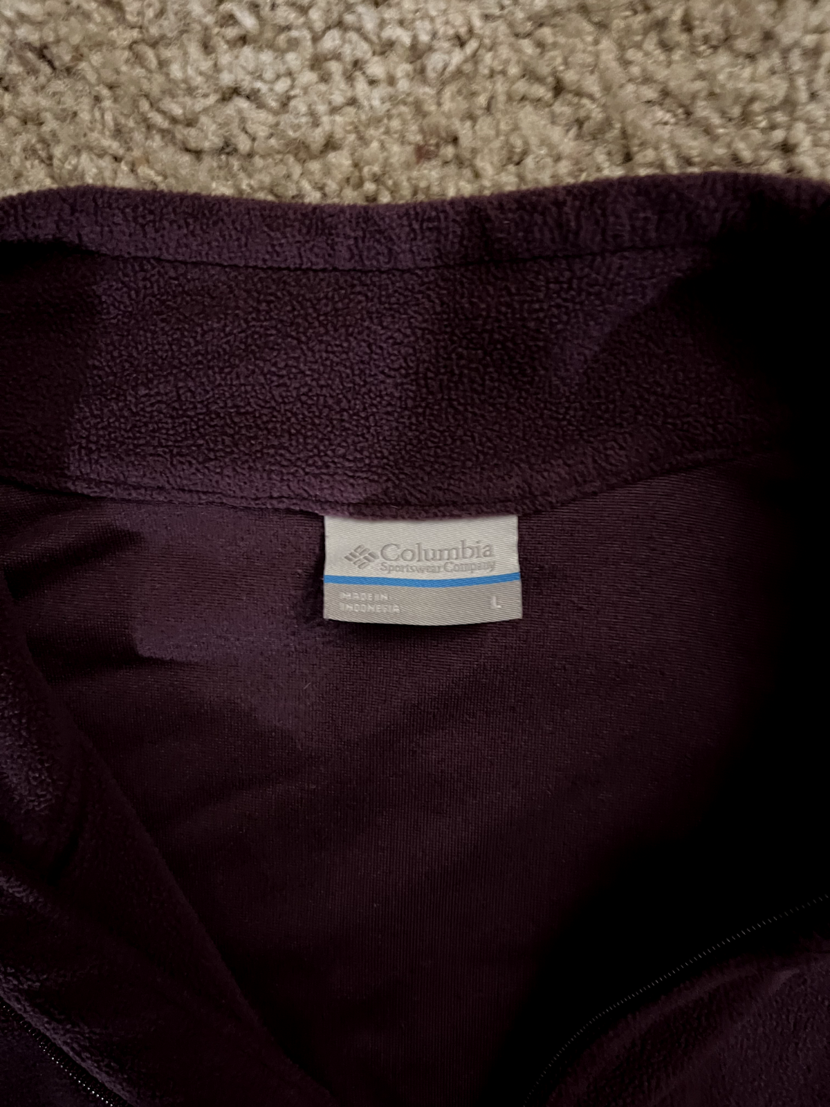 Columbia women’s quarter-zip fleece in an eggplant purple color, size large. Soft, warm, and perfect for layering in cool weather. Classic outdoor style with a cozy feel. Great condition