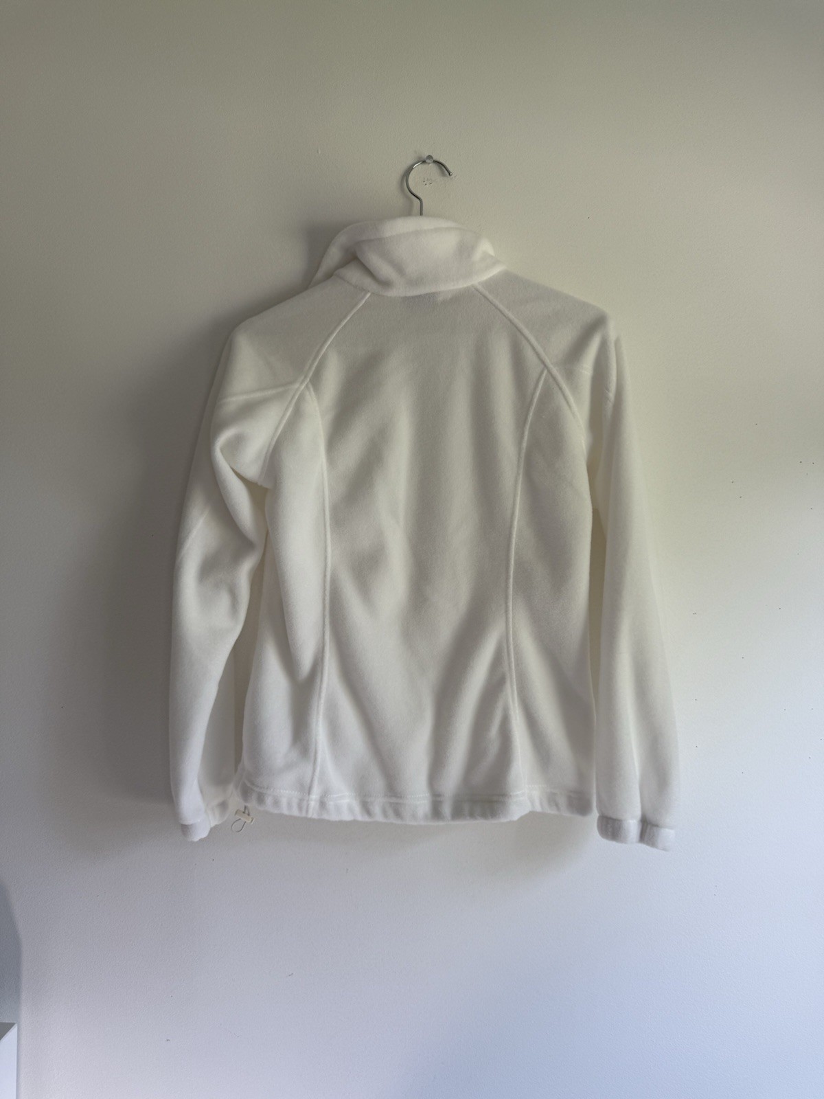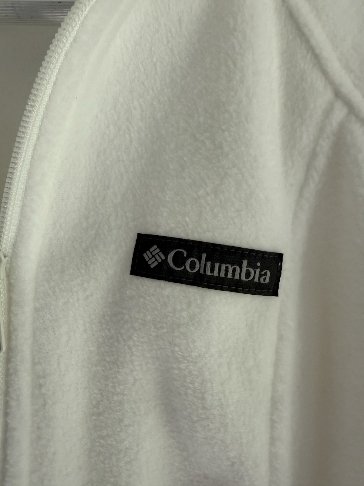 Stay cozy and stylish with this Columbia Sportswear women’s fleece jacket in classic white. Made from ultra-soft fleece, this full-zip hoodie features a high collar, adjustable drawcord hem, zippered hand pockets, and the signature Columbia logo on the chest. Perfect for layering in fall, winter, or chilly spring days. Ideal for hiking, travel, or everyday wear. • Size: Small • Color: White • Material: 100% polyester fleece (outer), tag inside mentions 55% linen / 45% cotton (possibly inner label from another item; fleece itself is polyester) • Features: Full zip, long sleeves, hood, side pockets, elastic cuffs, adjustable hem • Condition: Gently used, clean and in great condition 📏 Approximate measurements available upon request. 🚭 Smoke-free home. Columbia white fleece jacket, women's Columbia hoodie S, Columbia zip up fleece, Columbia Sportswear coat, Columbia S winter, white outdoor jacket, Columbia full zip S, Columbia fleece small