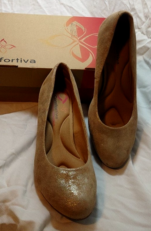 This item was previously used and is sold "As Is". See title and photographs for details and imperfections. Comfortiva Amora Anthracite Size 8.5 Wide Pillowtop Memory Foam Pumps - As Is