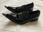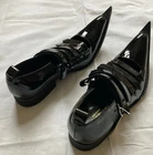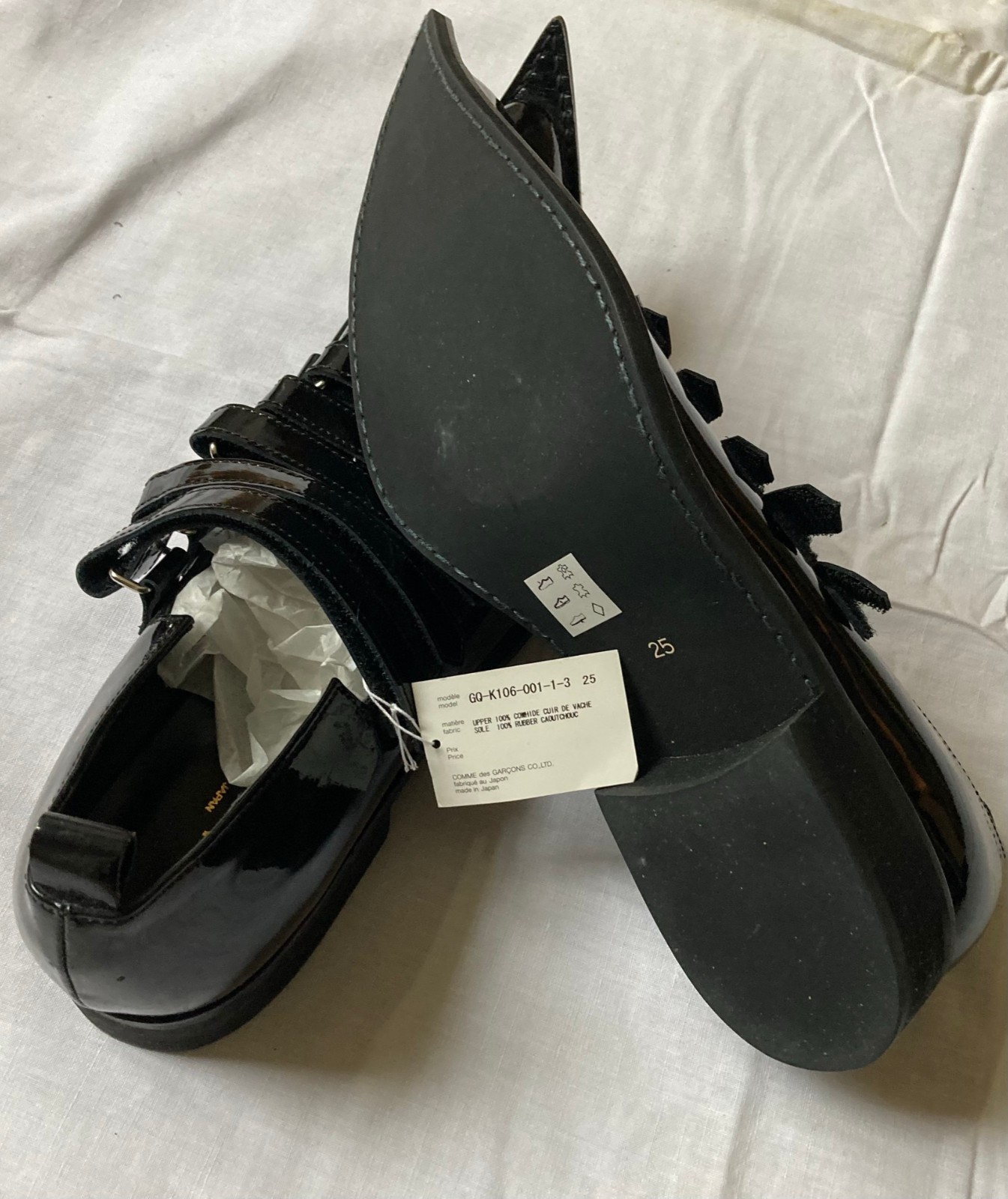 Comme des Garçons Runway Multi-Strap Patent Leather Flats - Spring 2016 Collection Iconic Runway Piece - Featured in Look of the Spring 2016 Show Condition: Brand New, Unworn - Original tags still attached Product Details: Brand: Comme des Garçons Model: GQ-K106-001-1-3 Collection: Spring/Summer 2016 Runway Size: 25 (Japanese sizing - approximately US Women's 7.5-8 / US Men's 6-6.5) Made in Japan Color: Black Patent Leather Materials: Upper: 100% Cowhide Leather (Patent Finish) Sole: 100% Rubber Item Description: Museum-quality Comme des Garçons flats from the iconic Spring 2016 runway collection, where these exact shoes were featured in every single look of the show. This extraordinary styling choice by Rei Kawakubo underscored their importance as a signature piece of the collection. These statement flats showcase CDG's signature avant-garde aesthetic with a dramatic multi-strap buckle system across the vamp, creating an edgy, bondage-inspired design that bridges punk sensibility with high fashion sophistication. The glossy black patent leather, extreme pointed toe, and silver-tone hardware create an unforgettable silhouette that defined the Spring 2016 runway. Crafted in Japan with meticulous attention to detail befitting a runway piece, these flats remain in pristine unworn condition with original tags attached - a rare find for such a significant collection item. Key Features: Runway Heritage: Featured in look of CDG Spring 2016 show Dramatic pointed toe with ultra-sleek, elongated silhouette Four adjustable straps with silver buckle hardware across vamp Glossy black patent leather in flawless, high-shine finish Low block heel (1.25") - surprisingly wearable despite dramatic appearance Subtle broguing/perforated detail along edges Gold foil branding: "COMME des GARÇONS MADE IN JAPAN" stamped inside Measurements: Sole Length: 12" (30.5 cm) Heel Height: 1.25" (3.2 cm) Toe Style: Extreme pointed toe Width: Standard