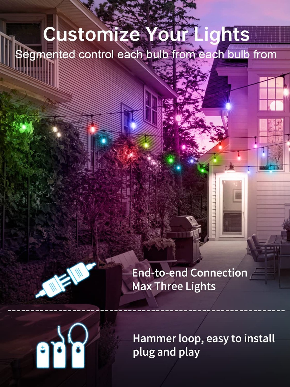 Commercial Grade 30FT LED Outdoor String Lights with Remote Control - Shatterproof Waterproof Color Changing Christmas Lights, Dimmable for Patio, Garden, Wedding Decor - Buy Now with Fast Shipping! Commercial Grade 30FT LED Outdoor String Lights with Remote Control - Shatterproof Waterproof Color Changing Christmas Lights, Dimmable for Patio, Garden, Wedding Decor Product Details Color: Multicolor Brand: LSOOBZ Indoor/Outdoor Usage: Outdoor, Indoor Special Feature: Shatterproof, Color Changing, Weather Resistant, Remote Controlled, Linkable, Dimmable Light Source Type: LED Power Source: Corded Electric Light Color: Multicolor Theme: Occasions, String Lights Occasion: Christmas, New Year, Wedding, Birthday Style: Modern & High-Tech Package Dimensions : 9.06 x 6.77 x 5.2 inches; 2.01 Pounds Item model number : MLS-D5V7.2WUI2-OR Date First Available : May 10, 2022 Manufacturer : LSOOBZ Country of Origin : China Customer Reviews: 4.2 4.2 out of 5 stars 1,543 ratings Color: Multicolor Brand: LSOOBZ Indoor/Outdoor Usage: Outdoor, Indoor Special Feature: Shatterproof, Color Changing, Weather Resistant, Remote Controlled, Linkable, Dimmable Light Source Type: LED Power Source: Corded Electric Light Color: Multicolor Theme: Occasions, String Lights Occasion: Christmas, New Year, Wedding, Birthday Style: Modern & High-Tech Material: Durable Plastic Bulbs,Rubber Wire,Copper Color Temperature: 2700 Kelvin Controller Type: Remote Control Connectivity Protocol: Proprietary/Unknown Number of Light Sources: 15 Voltage: 120 Volts Bulb Shape Size: S14 Wattage: 18 watts Bulb Base: E26 Included Components: 15 shatterproof LED Edison bulbs, 1 remote control Number of Items: 10 Control Method: Remote Water Resistance Level: Waterproof Seasons: Winter UPC: 768492201175 Form Factor: String Lights Manufacturer: LSOOBZ Part Number: 202000 Item Weight: 2.01 pounds Package Dimensions: 9.06 x 6.77 x 5.2 inches Country of Origin: China Item model number: MLS-D5V7.2WUI2-OR Shape: String Specific Uses: Outdoor use only Special Features: Shatterproof, Color Changing, Weather Resistant, Remote Controlled, Linkable, Dimmable Light Direction: Adjustable Batteries Included?: No Batteries Required?: No Luminous Flux: 1500 Lumen Bulb Features: Color Changing, Dimmable, Music Sync Date First Available: May 10, 2022 Key Features ✅ 16 Colors & 8 Modes + Voice Control- 2025 New Remote with Timer! 1-Tap Switch Modes (Party/Relax/Strobe), Adjust Speed/Brightness. Clap to Change Colors - Perfect for Weddings, Cafes, Pool Parties! ✅ True-Color LEDs with 1200 Lumens- 2025 Upgraded Chips Show 16M Colors! Transparent Bulbs Eliminate "Rainbow Spots" (vs Cheap Frosted Bulbs). Ideal for Ambiance Lighting in Hotels/Restaurants. ✅ Shatterproof & IP65 Waterproof- Passed 50KG Pressure Test! Commercial-Grade Copper Wire (vs 18AWG Cheap Wires) + E26 Bulbs Withstand -22F~140F. ✅ 3-Min Setup Our light string is designed for easy installation. With built-in loops, you can easily mount it to a flat surface with screws or hang it from above with cable ties or other loop fasteners (mounting hardware not included). With end-to-end connections on each chain, you can connect multiple cafe light strings together. ✅ New Version 1. Before use, ensure that each light bulb is tightened. 2. Please ensure that the control power supply is well connected to the light string. Light strings purchased after January 1, 2025 cannot be connected to the original light strings purchased before; Please use it separately. New and old equipment differentiation standards, updated remote control shape, increased monochrome function, and added timing function. Product Description