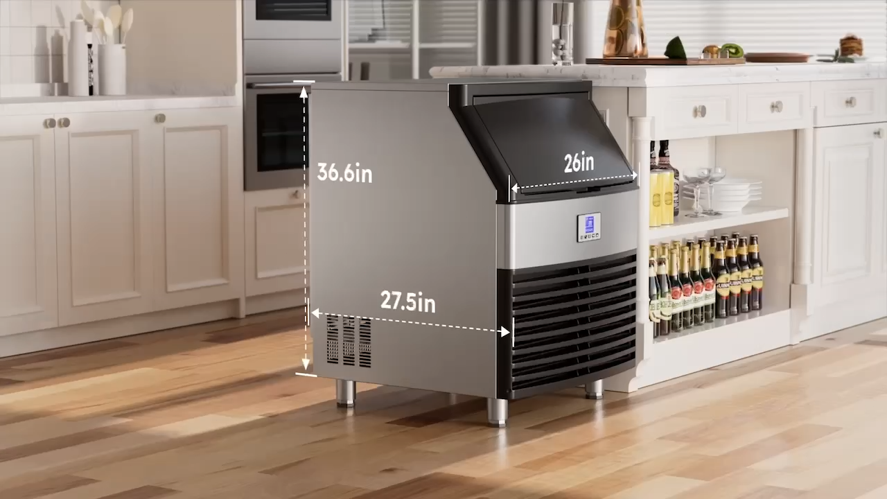 Description Upgraded Commercial Ice Maker Machine 300LBS/24H 350LBS/24H 450LBS/24H with 120lbs Storage Bin, Stainless Steel Ice Scoop, Blue Light, Freestanding Ice Machine for Home, Restaurants, Bars Ice Making Capacity: 300lbs/24h; 350lbs/24h; 450lbs/24h (For choice options) Voltage:115V, 60Hz Longest preset time: 24H Storage Capacity: 100lbs ; Ice Number/Cycle: 126pcs clear ice cubes Material: Stainless Steels Application: Home Bar Coffee Food Shop Size: 28"D x 26"W x 37"H Ice cube size: 0.87”x0.87”x0.87”/2.2x2.2x2cm Intelligent LCD Panel: Ice Maker Commercial is equipped with an LCD panel Uniqueness: Compact Size Large Capacity Large Industrial Ice Machine 300~450lbs/24h High Efficiency : Never run out of ice again with the commercial freestanding ice maker; It can produce up to 300lbs/350lbs/450lbs of ice in 24 hours, store up to 100lbs of ice and make 126 clear and hard ice cubes every 8-15 minute cycle; Say goodbye to trips to the store and always have fresh ice on hand. Ice cubes maded by this light ice maker is 0.87”x0.87”x0.79”/2.2x2.2x2cm, which is larger. And the thickness of the ice cube can be adjusted by changing ice making time Quality Certifications: Our ice makers under counter passed the ETL certification with its heavy duty stainless steel shell surface, cyclopentane foaming layer, food-grade pp liner, high quality compressor, copper tube, water filter and powerful fans, ensuring a continuous supply of healthy ice for you and your customers. The premium water filter can turn tap water into pure water, making ice clear. Food-grade PP injection liner interior grants a safe and hygienic ice-making environment Electricity Saving and Quiet: The highly efficient CFC-free upgraded compressor allows the the commercial ice machine to save up to 35% on electricity, quickly driving up the freezing system and providing you with a constant supply of freshest ice at amazingly high efficiencies. In addition, it operates quietly, providing you with a comfortable environment. The ice maker is perfect for keeping drinks at the ideal temperature for offices, homes, restaurants, bars, hotels, parties and hosting EXTENDED COOLING TIME: The ice maker machine commercial is equipped with a 20% thicker cyclopentane insulation layer, delivering excellent insulation performance by blocking external heat. The insulation time is extended from 6 hours to 8 hours, effectively preventing ice cubes from melting. Built in Blue Light, this ice making machine improves the maintenance time of ice, slowing down the speed of ice melting. Designed with flip cover, it is easy to facilitate ice fetching with given ice scoop ADVANCED INTELLIGENT EXPERIENCE: Compared with ordinary ice maker machines, operations can be solved in this smart LCD control panel, adjusting the ice thickness, one key cleaning, 24-hour reservation, defrosting, reminders and other functions can be realized with one poke, simple operation while bringing the upgrade of appearance and advanced intelligent feeling of use. With reminders functions, you can easily know about ice full or water shortage EXPERIENCED SUPPORT TEAM: Before first using, please keep it upright for 24h and read the instruction manual. With Malfunction reminders and comprehensive instruction manual, small problems can be easily solved. And our dedicated support team consists of experienced professionals who are well-equipped to handle any post-purchase issues or questions. They have the knowledge and expertise about commercial ice machines and can provide reliable assistance and solutions