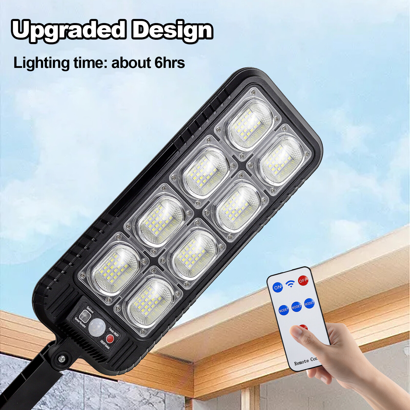 Product Description: Specifications: Product Name: Solar Street Light Light Body Material: ABS + PC Light Color: Cold White 6500K Waterproof: IP65 Battery Capacity: 3.7V 2400mAh Charging Time: 6 ~ 8hrs Direct in the Sun Working Time: 6~ 10hrs Installation Height: 2 ~ 3m / 6.56 ~ 9.84ft Lamp Body Size: 31.5 x 13.1cm / 12.4 x 5.16in Light Arm: 12.4cm / 4.88in LED QTY: 200SMD 3 Lighting Modes: OFF: Light OFF Mode; Mode 1: Lights on when people pass by, lights off when people leave; Mode 2: Lights on when people pass by, 20% brightness when people are away; Mode 3: Automatically light up when dark, Keep on till the sky gets bright. Package Included: 1 x Solar Street Light 1 x Remote Control 1 x Set of Installation Accessories LED Solar Light Outdoor: The LED solar street lights outdoor produce ultra-high brightness illumination for a wide area, providing lighting and security to front door, pathway, gutter, porch, front/back yards, gardens, driveways, fence, wall, stairways, landscape, patio or any outdoor places that needs lighting, bring you a super bright lighting experience. 3 Optional Modes & Remote Control: 1. Sensing Mode - Strong light for 20s once movement detected, then turn off. 2. Constant Light + Sensing Mode - Dim light all night, and strong light for 20s when sensor detects movement. 3. Constant Light Mode - Medium light mode all night. 120° Wide-Angle Solar Lighting: The outdoor wall lights features high sensitivity and adjustable bracket design, can sensitively sense moving objects in 10 ~ 15ft with 120° range, providing security and convenience for your home when night falls. High Efficient Solar LED Outdoor Lights: These solar light are made of more energy saving laminated solar panel and premium LED lights, which will be more long-lasting and suitable for longer usage time. Build-in 2400mAh rechargeable lithium-ion battery to allows the LED solar lights to be continuously illuminated for 6 ~ 10 hours in bright mode to meet your lighting needs. IP65 Waterproof & Easy Installation: The solar street lights is made of long-lasting and high-impact ABS Material which makes it to withstand a variety of outdoor environments and other extreme weather conditions. Easy to install and set, no wire and tools need.