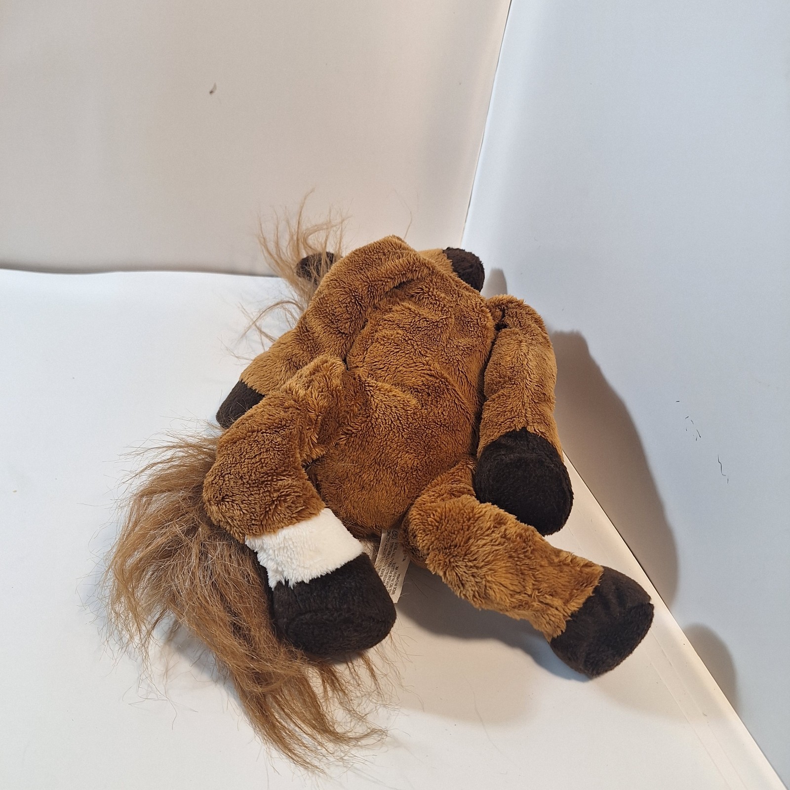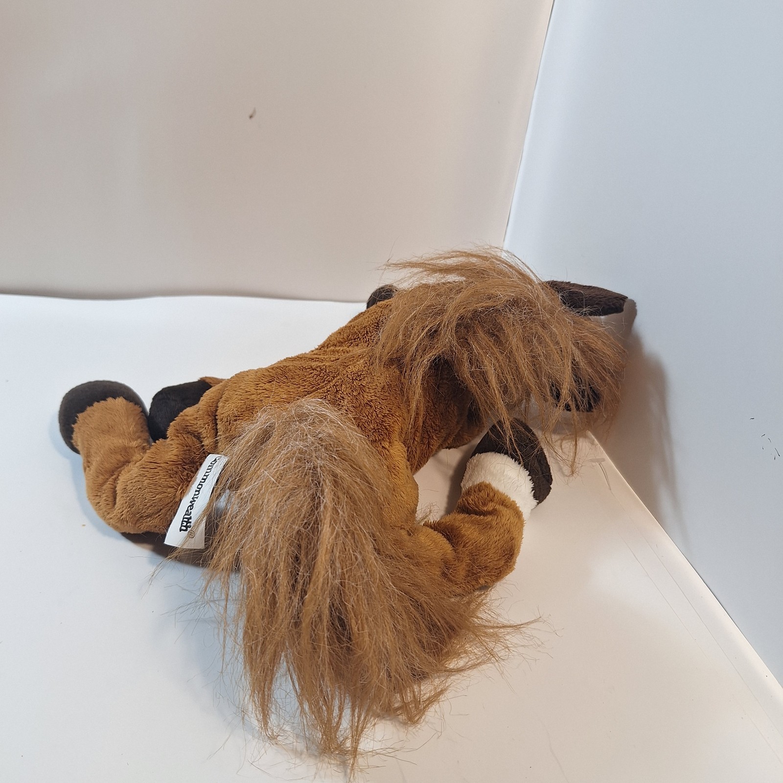 The product is a 14" plush horse pony stallion from the brand Commonwealth, manufactured in 2003. It is designed with brown and white colors, making it suitable for children aged 3-4 years. This stuffed animal is part of the character family of plush toys, providing a soft and cuddly addition to any collection of stuffed animals.