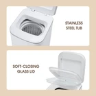 【Compact Design】 The Portable Washing Machine measures 16.53 x 17.91 x 28.5 inches, only utilizing under 2.15 sq. ft. of floor space. One tub serves both washing and spinning functions. Requiring minimal storage space, this compact washer is ideal for small spaces like dorms, apartments, and RVs. 【Full Automatic Functionality】 The Mini Washing Machine is fully automatic and finishes the washing task with the press of a button, freeing you from daily handwashing. It offers 8 wash programs and 4 water level settings designed for various needs, and is able to perform a spin-dry task alone. 【Quality Materials & Elegant Design】 The Portable Washing Machine uses stainless steel on its tub for durability and easy maintenance. The top lid is made of reinforced glass with a soft-close mechanism to deliver a better user experience. Touch-sensitive buttons as well as an LED display indicating the remaining time adds to the elegant appearance. 【Thoughtful Features】 The Washer allows a 24-hour delay for the start of a wash cycles to suit your schedule. Run the machine during off-peak hours to save on the electricity bill. The Child Lock helps to freeze the control panel to ensure it keeps running smoothly. The Tub Clean program activates a thorough cleaning process from the inside out to ensure consistently good washing performance. 【Quality Control Note】 Each unit of undergoes manufacturer's rigorous quality tests to guarantee full functionality, so having a little amount of residual water in the unit is NORMAL. provides a one-year warranty for all new units. If you have any questions about the product, please feel free to contact us and we will try our best to help you! 【8 Wash Program Options】 The compact washer offers 8 wash programs, including Normal, Quick, Gentle, Heavy, Soak, Rinse & Spin, Spin, and Tub Clean, and they operate with 4 water level settings, quietly at less than 60 dB. 【Package Contents】 1 x T01 Washing Machine, 1 x User Manual, 1 x Water Supply Hose, 1 x Drain Hose, 1 x Protective Bottom Plate, 2 x Screws. 【Note for Draining】 The T01 does not drain upwards. Please make sure that the drain hose lies flat on the floor and no part of the drain hose is more than 4 inches above the floor.