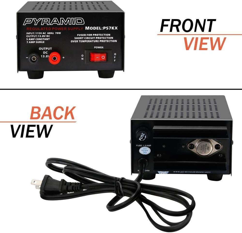 Universal Compact Bench Power Supply 5 Amp Linear Regulated Home Lab Benchtop ✅ Pyramid Universal Compact Bench Power Supply - 5 Amp Linear Regulated Home Lab Benchtop AC-to-DC 12V Converter w/ 13.8 Volt DC 115V AC 70 Watt Power Input, Screw Type Terminals, Cooling Fan - PS7KX Product Description: The Pyramid Universal Compact Bench Power Supply is a high-performance 5-amp linear regulated power supply, designed for use in home labs and electronics projects. With a 12V DC output and 13.8V DC option, this power supply provides reliable and stable power for various applications. Equipped with screw-type terminals and a built-in cooling fan, it ensures efficient performance and safe operation for all your benchtop needs. Features: Linear Regulated Design: Provides consistent and stable power output for precise and reliable performance during experiments and projects. 5 Amp Output Capacity: Delivers up to 5 amps of current, making it suitable for powering a wide range of electronic devices and components. 12V DC Output with 13.8V Option: Features a 12V DC output with an additional 13.8V DC option, offering flexibility for different voltage requirements. Cooling Fan for Optimal Performance: Includes a built-in cooling fan to prevent overheating, ensuring continuous operation during long sessions. Screw-Type Terminals: Equipped with easy-to-use screw-type terminals for secure connections and improved durability. Compact and Durable Design: The small form factor and rugged construction make it ideal for benchtop use in home labs or workshop environments. Efficient Power Input: Operates with a 115V AC 70-watt power input, providing a stable and efficient conversion for everyday use. Versatile Application: Perfect for use with various electronics, including radios, amplifiers, and other benchtop testing equipment. Whats in the box 1 Branded Product Style Power Supply Color BLACK Product Dimensions 7.5 x 4.9 x 3 inches Material Metal Connector Type plug-in Item Weight 5.4 Pounds Frequency 60 Hz Other display features Wireless Form Factor box-shaped Shipping Fast shipping is very important for us. Our standard USA shipping service is FREE. Your order will be shipped within 1-2 business days upon full payment received. Your order will be delivered within 1-3 business days after the handling time. We only ship to the confirmed address. We reserve the right to cancel any order for any reason at any time. We are not responsible for undeliverable addresses. Returns and payment We offer a 30 days return policy from checkout winning date. FeedBack Your feedback very important to us, after you get your package and you are satisfied with our service please leave us positive feedback If you have any problem with your order / any questions please before leave any type of feedback For any questions, using eBay contact system Please visit our eBay store to check out other items for sale! Thank you for shopping at our store.
