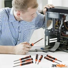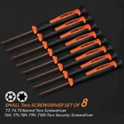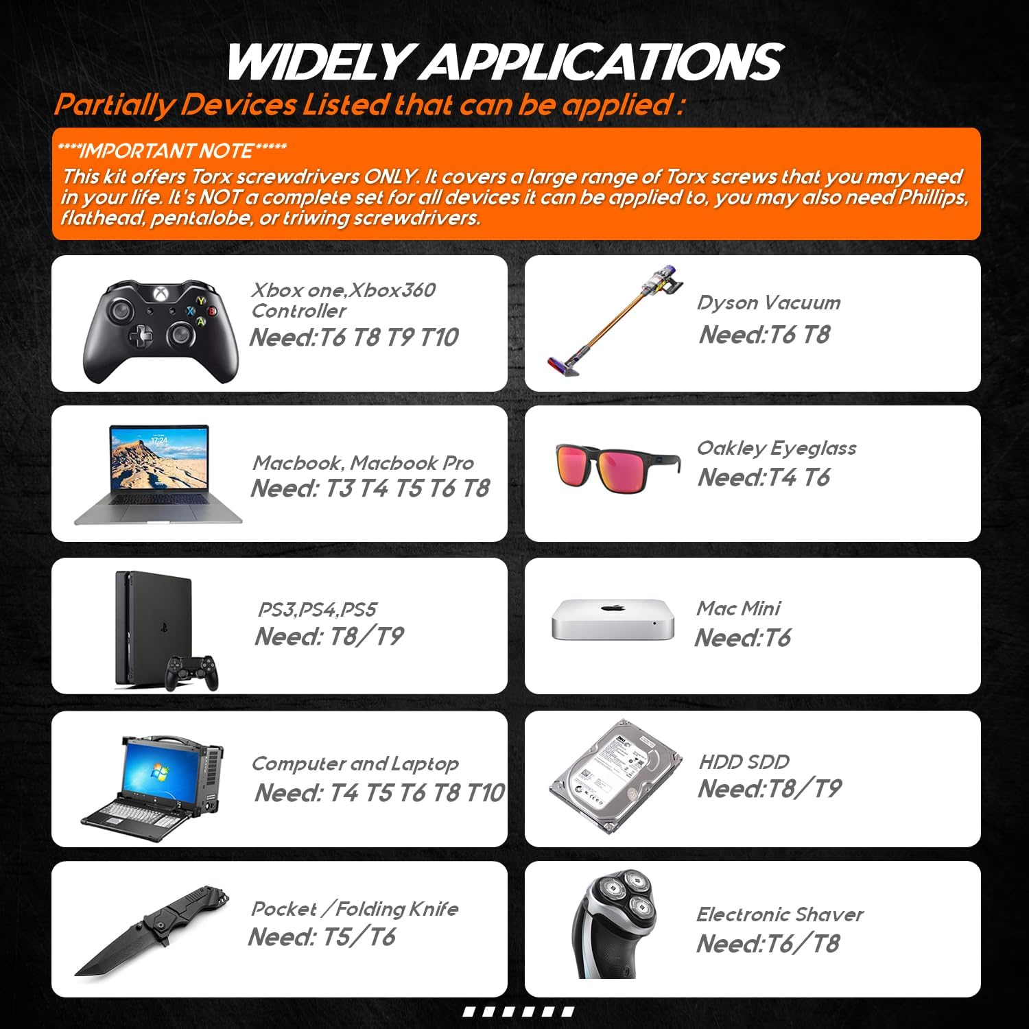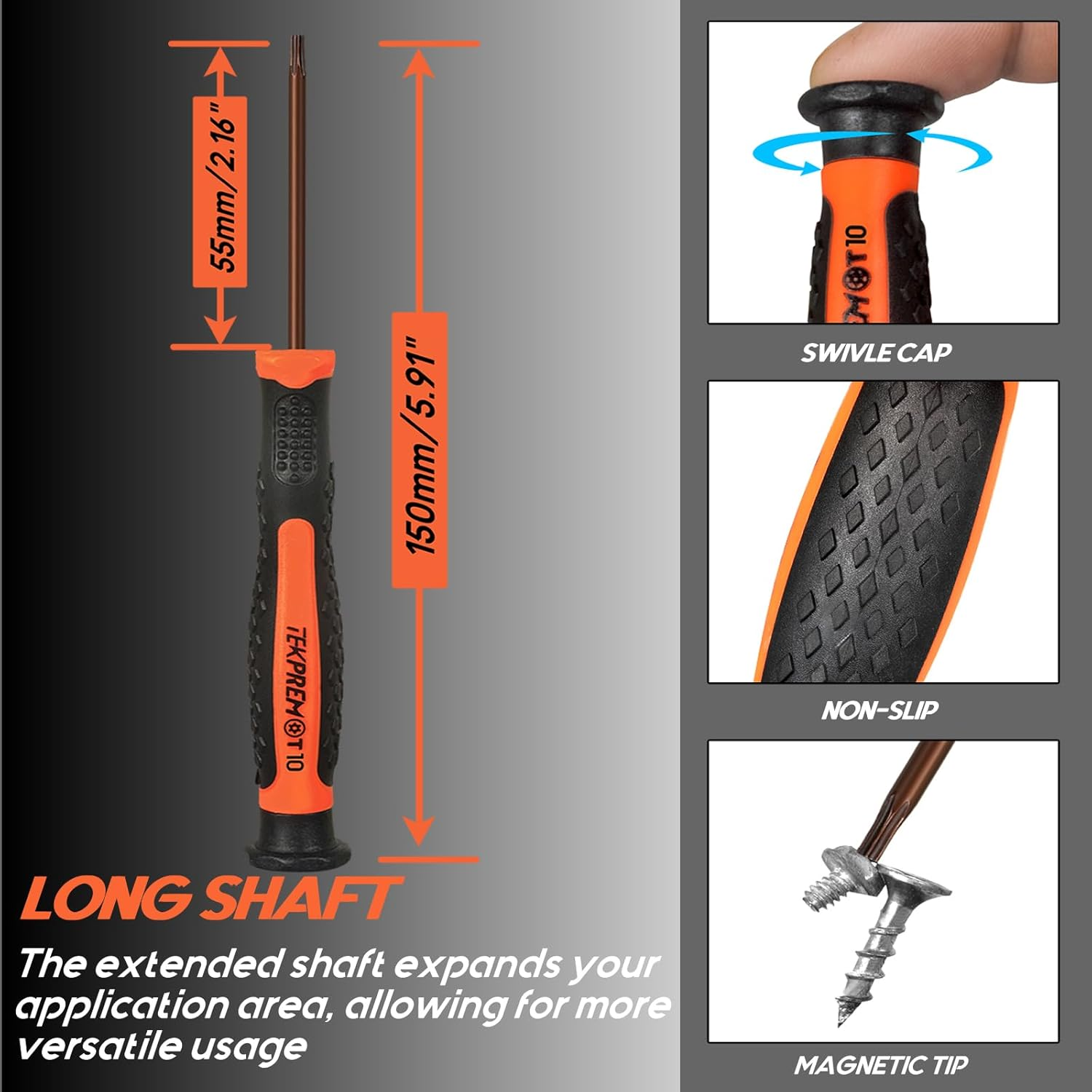 [Small Torx Screwdrivers Tool Set]: The new TEKRREM small, complete Torx screwdriver set includes T3, T4, and T5 Torx screwdrivers, as well as T6, T7, T8, T9, and T10 security Torx screwdrivers. This compact and convenient tool kit comes neatly packed in a plastic zip-lock bag, ensuring easy storage. [Hardened S2 Steel Torx Screwdriver Bits]: All Torx bits are crafted from hardened S2 steel, providing exceptional durability and strength for daily use. These bits are precisely designed to fit and remove small Torx screws effortlessly. [A MUST-HAVE Torx Set]: The bit shafts are 2.16 inches (55mm) long, making them ideal for screws located in deep holes. This set is suitable for use with Xbox One, Xbox 360 and controllers, MacBook, Mac Mini, PS3, PS4, computers, laptops, electronics, smartphones, small devices, folding knives, and more. [Magnetic Torx Screwdrivers]: The precision Torx screwdrivers are magnetic, making it easy and convenient to pick up tiny screws. [Non-slip Handle]: These Torx screwdriver handles are made of plastic with TPR and PP materials. They feature an ergonomic grip for repeated use and a swivel cap for convenient handling. Product Description Normal and Torx Security Screwdriver Set This torx screwdriver kit include 3 normal T3 T4 T5 torx screwdrivers and 5 torx security screwdrivers T6H T7H T8H T9H T10H torx security screwdrivers. Torx security screwdrivers are those bits which have a tiny hole that can used for tamper proof screws, they're better and more widely used screwdrivers. This is a 8in1 complete torx tool kit from T3- T10, a MUST have small torx screwdriver set for household and work applications. It's a great addition to your tool box. Made of Quality S2 Steel The screwdriver bits are made of S2 steel, good and fine small torx repair tool kit to repair household devices,game consoles,routers,toys,cleaner and other special torx screws removal. All the bits are hardenedly with special heat treatment, precise and accurate to fit and remove your torx screws with no hassle. All Magnetic Screwdrivers All the torx screwdrivers are magnetic which are convenient to hold tiny screws. No worries of dropping your screws when using these screwdrivers. Non-slip Handles The screwdriver andle are made of plastic with TPR and PP material. Ergonomic grip for repeated use. Flexible with Swivel Cap It is convenient to hold in hand and freely turn with swivel cap, good for long time use. Widely Application Small Torx Set Widely used for many types of electronic devices including Xbox one,Xbox 360 and controller, Macbook,Mac Mini,PS3,PS4,Computer,Laptop,Smartphones,HDD replacement,folding knife and other repairs.