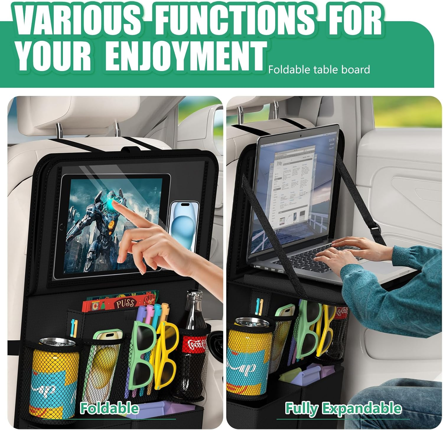 This car backseat organizer is a game-changer for road trips! The 11 pockets keep snacks, toys, and essentials neatly stored, while the foldable tray doubles as a dining table or drawing desk for kids. The kick-proof design protects seats, and the tablet holder keeps little ones entertained. Super sturdy and easy to install—perfect for keeping the car tidy with kids on board!