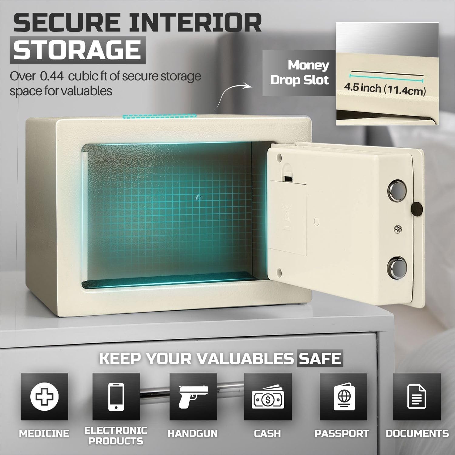 The small money drop slot is the perfect solution for secure storage at home, in the office, or for business use. Designed as a money drop box with lock and slot, it allows hassle-free deposits without needing to open the safe, making it an excellent cash drop box for business operations or cash handling tasks. This cash drop safe features a digital keypad with reprogrammable access codes, offering keyless convenience and enhanced security. Built to resist tampering, this security safe box is equipped with live-door bolts and concealed hinges for superior protection. With over 550 cubic inches of storage capacity, this is ideal for safeguarding your valuables, including cash, important documents, and jewelry. Its compact design and adjustable shelf make it versatile, functioning as a drop box safe, a safe deposit box for home, or even a hotel safe. For added convenience, this electronic safe includes emergency override keys and mounting hardware, allowing secure installation on floors, walls, or shelves. Protect your valuables with this reliable and durable, crafted to deliver peace of mind and security in any setting. Specification: Operation: Digital PIN or Override Key Dimension: 12" x 8" x 8"(W x D x H ) Material: Solid Steel Color: White Package Content: 1x Small Safe Box with Drop Slot - Electronic Drop Safe Box for Money with Digital Combination Keypad Lock - Cash Safe Box for Cabinets, Home & Office Security (12"x8"x8"), White Secure and Durable Design: This cash safe box with drop slot offers over 550 cubic inches of secure interior storage space, perfect for safeguarding legal documents, jewelry, passports, cash, and other valuables. Ideal as a money safe for cash Reprogrammable Digital Access: Safe with code features a customizable 8-digit digital code for easy, keyless entry and enhanced security with a lockout mechanism after multiple incorrect PIN entries. Designed as a safe with drop slot, its perfect for securely storing cash, documents, and valuables Emergency Access with Override Keys: Includes 2 override keys to access your hotel safe or drop safe for business even if the code is forgotten or batteries run out Tamper-Proof Design: Built with solid steel, this safety deposit box for home features live-door bolts and concealed hinges to resist tampering, ensuring the safety of your valuables and serving as a reliable safe for money Adjustable and Mountable Design: This small safe box includes an adjustable shelf and mounting hardware, allowing you to secure it to a wall, floor, or shelf for added protection and convenience. Perfect as a small money safe to keep your valuables organized and secure