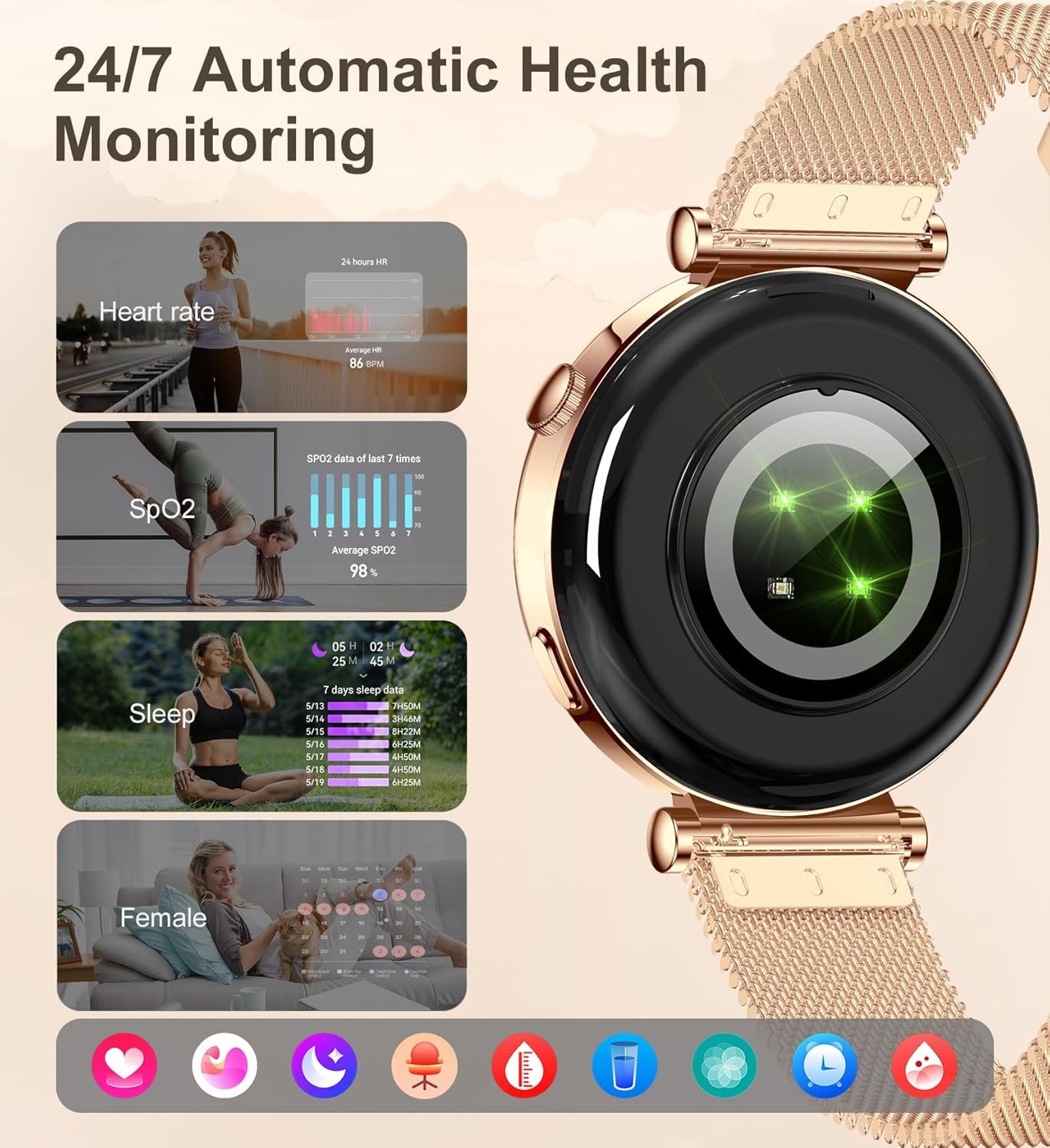 Small Smart Watch for Women with Bluetooth Call, 1.27" Rosegold_Burgundy LuxeFusion Product Description Features Durability and Convenience: Wrist watches for women featuring a 290mAh battery (1-2 days heavy use, 3-5 days normal use); IP67 rating makes it ideal for daily activities like rain, handwashing, and sweating Product Details Product Dimensions: 1.61 x 1.73 x 0.43 inches Item Weight: 7.8 ounces Batteries: 1 Lithium Ion batteries required. (included) Manufacturer: Iaret Standing screen display size: 1.27 Inches Special Feature: Time Display, Touchscreen, 4 Menu Style Switch, DIY Watch Faces, Vibration intensity, Brightness Adjustment, Screen time, Raise to Wake Time Display, Touchscreen, 4 Menu Style Switch, DIY Watch Faces, Vibration intensity, Brightness Adjustment, Screen time, Raise to WakeTime Display, Touchscreen, 4 Menu Style Switch, DIY Watch Faces, Vibration intensity, Brightness Adjustment, Screen time, Raise to Wake See more Connectivity Technology: Bluetooth Wireless Communication Standard: Bluetooth Battery Cell Composition: Lithium Polymer GPS: GPS Via Smartphone Shape: Round Screen Size: 1.27 Inches Brand: Iaret Model Name: I109-2 Style: Modern Free Shipping All orders ship free and fast to your doorstep. Easy Returns Satisfaction guaranteed. 30-day returns, no questions asked. 24/7 Support Contact us anytime; we’re here to help, day or night. Brought to you by LuxeFusion – Quality you can trust.