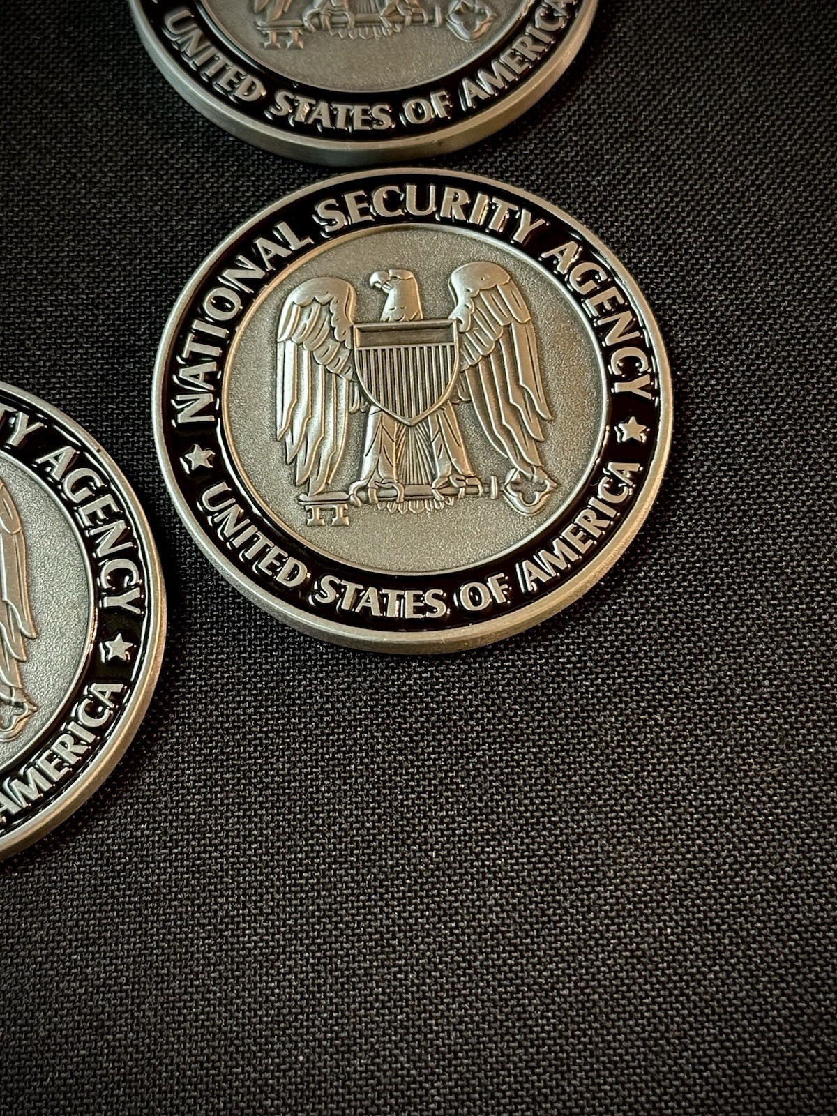 Rare set of six U.S. Intelligence & Military Challenge Coins representing each branch of service (Army, Navy, Air Force, Marine Corps, Coast Guard, and Space Force). Army has the largest contingent of personnel at NSA, and is represented by a gold coin. Offered in a rare and highly collectible set of U.S. Government and Military challenge coins, featuring multiple National Security Agency (NSA) variants alongside official United States Armed Forces branch coins. These coins are seldom seen together and make an exceptional addition to any military, intelligence, or challenge coin collection. Details: -Material: Hardened enamel -Size: 1.75” diameter (approx.) -Weight: 2.5 oz each (approx.) -Design: Official NSA and Military Services engraving -Limited Edition: Rare collectible for serious enthusiasts -Condition: Brand new, authentic, collection ready -Sourcing: Obtained from an active member of the organization -Description: Military memorabilia; veteran gift; limited edition intelligence community collectible