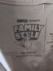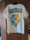 A Complex Family Style Pokémon Pikachu T-Shirt for men in size Large. Made of cotton with a graphic print featuring Pikachu, Charmander, Bulbasaur, and Squirtle. The shirt has short sleeves, a crew neck, and a regular fit, perfect for fans of the Pokémon franchise.