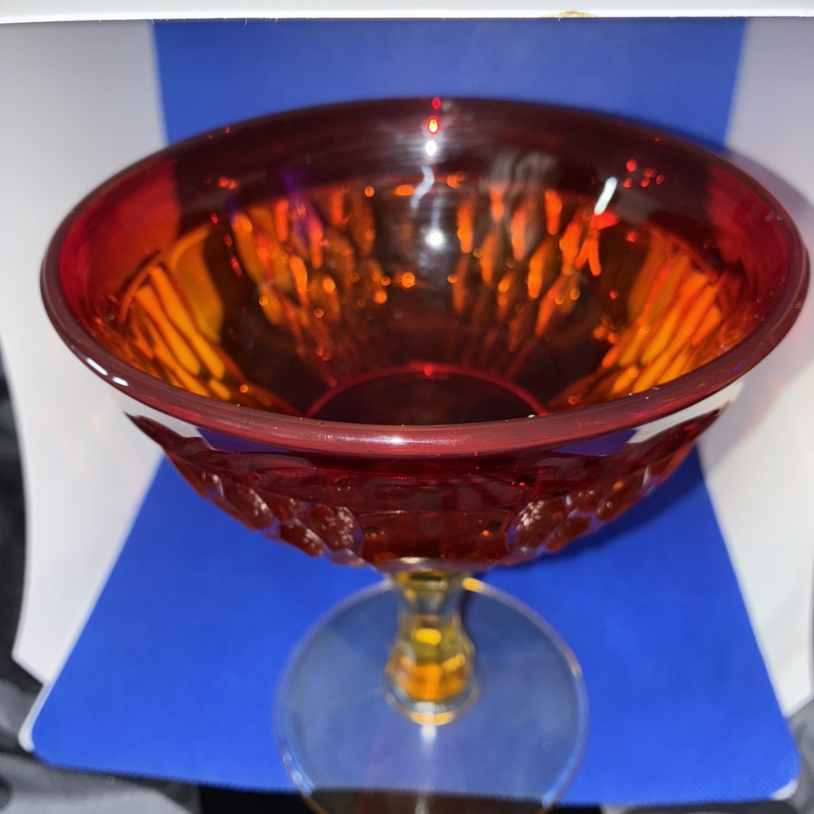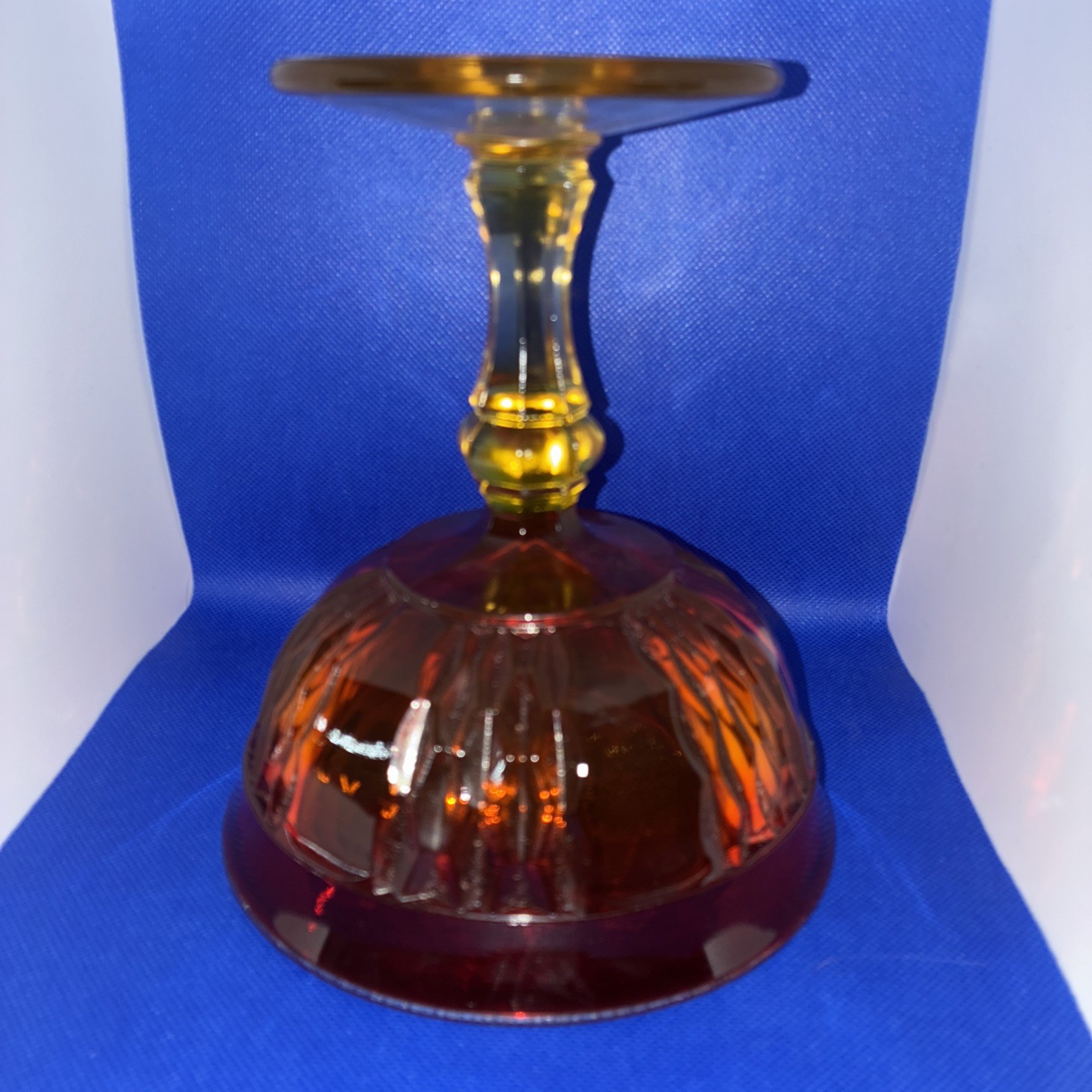 The Compote Candy Dish is a vintage piece handmade in the United States during the 1960s. This Amberina glass chalice pedestal bowl features a bright orange and yellow color with a Mid-Century Modern style. The hand-blown glass dish stands at 6.5 inches tall and is unmarked, embodying the art glass production style of the era. Perfect for adding a touch of retro charm to any space, this unique and original piece captures the essence of mid 20th-century design aesthetics.
