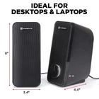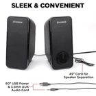 SonaVERSE UB2 Multimedia USB Powered PC Speakers for Desktops & Laptops 2-Way Speaker Design Enhances Clarity and Bass 's UB2 speakers have a 2-way driver construction that allows each driver to focus on specialized frequency ranges so that together they deliver crystal clear audio. The smaller tweeter handles high frequencies while the larger driver produces the mids and lows for solid bass. This way, each driver is dedicated to a fine-tuned frequency range and you experience fuller sound by preserving the bass of blockbuster booms and blasts while still delivering clear dialogue. Simple USB Powered Setup for Easy Listening Built-in 60" USB power & 3.5mm AUX audio cables let you connect the UB2 directly to your computer without the need for an AC outlet. Experience 2.0 bass-rich audio without messy cable nests found with 3-unit speaker systems (left channel, right channel, separate subwoofer) and all their audio/power connector cables. Convenient Pass-Through & AUX Ports Connect headphones to the UB2's built-in 3.5mm port to enjoy private listening, all without having to unplug the UB2 speakers from your PC to free up the port. If you want to play audio on UB2s off a or , you can connect using a 3.5mm AUX cord (not included) to the built in bypass audio port. 32W Peak Audio Power With a 1.5-inch tweeter and dedicated 3-inch driver in each UB2 speaker, you will experience 32W of peak audio power when binging on your favorite shows and movies. Each speaker measures 8-inches tall, 3.4-inches wide, 4.4-inches deep, and are connected to each other with 45-inch cord that allows sufficient separation for most computer monitors. The LED-lit volume knob lets you adjust how loud you want to enjoy your media and is always at hand's reach for ultimate convenience. ULTRA CLEAR BALANCED AUDIO – Specialized 2-way drivers with fine-tuned frequency ranges produce optimal sound; tweeter handles high frequencies while larger driver delivers bass via mids & lows SIMPLE SETUP WITH 60" POWER & AUDIO CORDS – Experience rich stereo audio in minutes with easy Plug-and-Play installation: USB 2.0 cable for power and 3.5mm AUX headphone jack cable for audio input HEADPHONE & AUX INPUT PORT ENABLED – Connect headphones directly to speakers for private listening, or play audio from a by connecting with your 3.5mm AUX cord to bypass PC audio PRECISION-TUNED DESKTOP SPEAKERS AT AN AFFORDABLE PRICE – Enjoy superior audio detail with crystal-clear dialogue, high-quality construction, easy setup, and conveniently long connection cables LED VOLUME KNOB – Functions as On/Off power switch and volume dial that glows blue around edge to complete the premium build design of the UB2 | Quality backed by a 3 Year Manufacturer