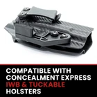 Eliminates Printing of Your CCW: Say goodbye to printing forever with our inside-the-waistband and tuckable claw kit; our gun holster claw attachment angles the butt of your gun in towards your body to eliminate any printing, giving you maximum concealability with your concealed carry weapon Precision Craftsmanship: 100% made in the USA, our holster claws are formed over our proprietary, precision aluminum molds; CAD-designed and milled in house, we ensure top quality, durability and fit for every claw we make Custom Design & Fit: Built to fit your Concealment Express holster, our claw accessory can be installed in seconds; it works with both right and left handed IWB & tuckable holsters with double hole retention (with .60” spacing). The Claw is built for Rounded by Concealment Express holsters and may not be compatible with other holster brands. All the Hardware You Need: This concealment claw kit includes 1 reversible claw base, 1 short claw standoff, 1 tall claw standoff, 1 flat screw, 1 nut, 4 rubber spacers, 2 short pan head screws and 2 long pan head screws