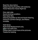 Read the description. Digital Hearing Amplifier with batteries Noise Reduction Assist Right Ear Only right side. Good working condition. New Open Box. Hearing Amplifier to Aid and Assist Hearing, Premium Comfort Design, and Nearly Invisible. T622 Silver. Right Side Replacement only. New in an open box. Please take a close look at the pictures. Thanks for looking