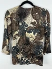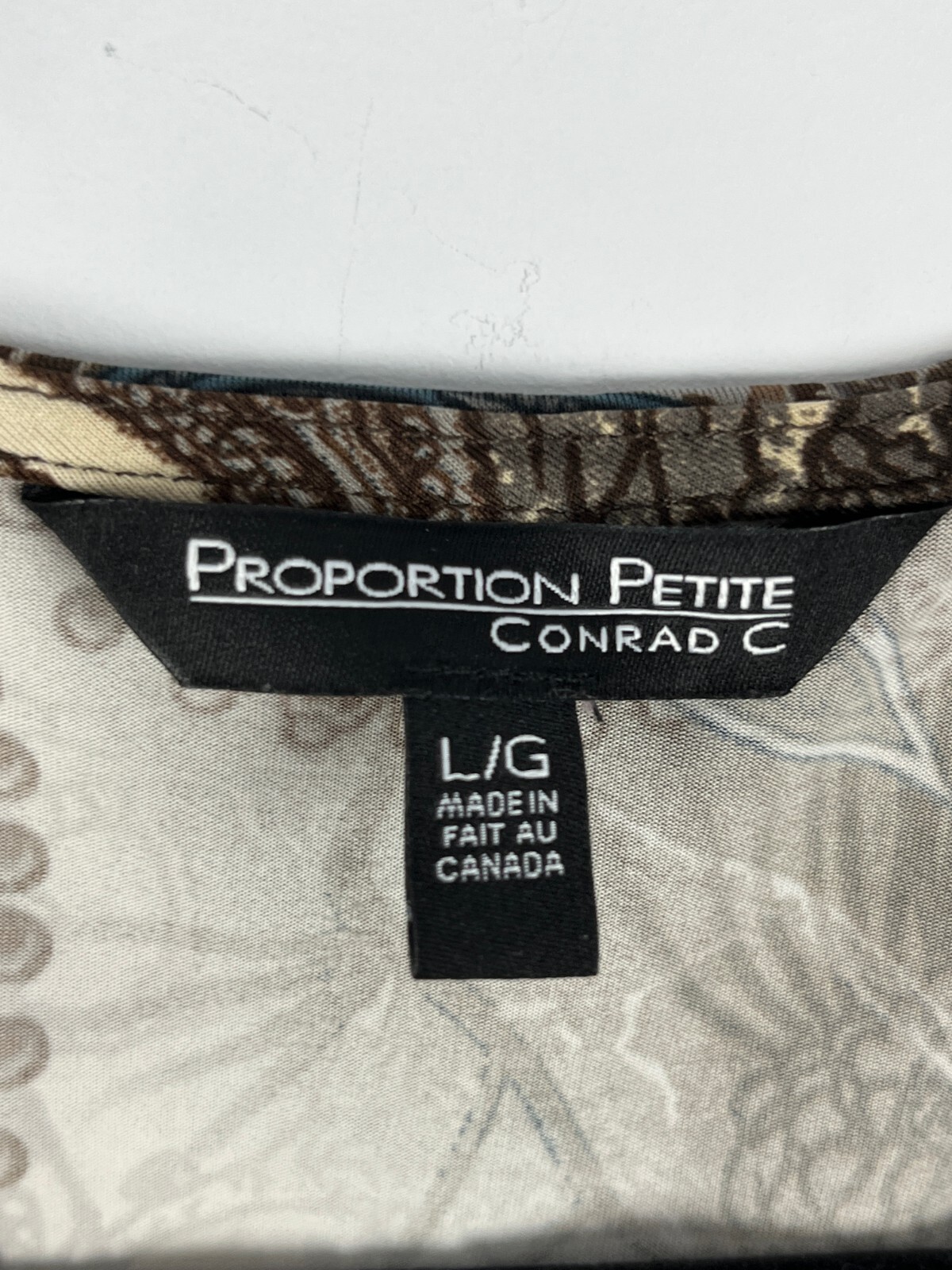 Elevate your wardrobe with the versatile Conrad C top, a piece that effortlessly transitions from day to night. This brown and beige paisley blouse, sized large, features a comfortable round neck and casual 3/4 sleeves. Designed for women who appreciate a blend of style and comfort, the blouse is crafted from a lightweight mix of polyester and spandex, ensuring a stretchy fit that moves with you. Ideal for various occasions, whether it's casual outings, cocktail parties, or work events, this top is machine washable for easy care. The pullover closure adds to its convenience, making it a practical choice for the modern individual. With its neutral palette and timeless paisley pattern, this blouse is a staple for fall, spring, and summer fashion. Dimensions Shoulder to shoulder 15in Pit to pit 18in Shoulder to bottom 22in