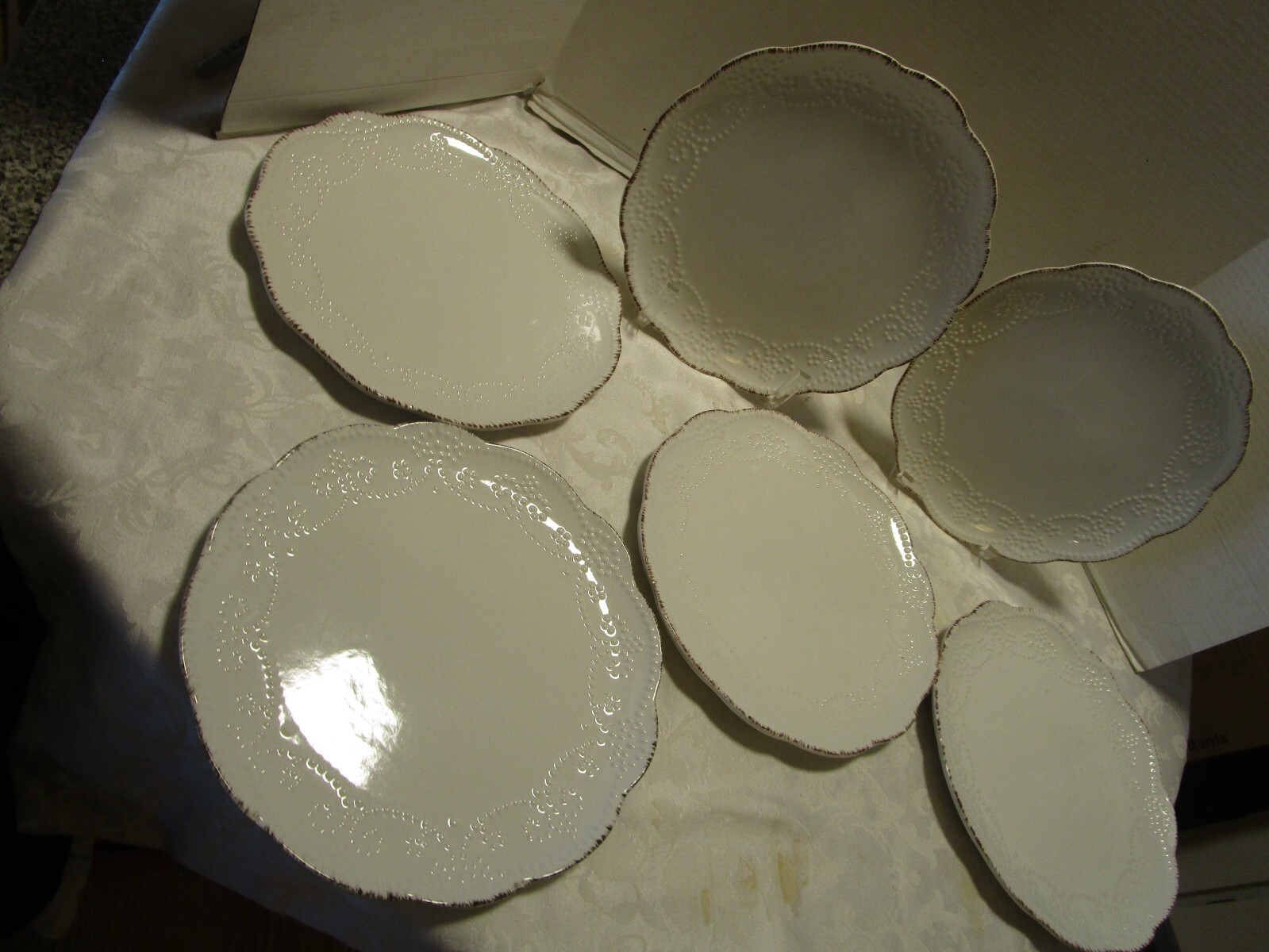 Description: 18/17/17/10 Book # 1970 Pfaltzgraff Everly Line combines elegant accents with a classic design for a look that is both trendy and timeless. A raised bead pattern adorns each piece, and the dramatic, scalloped edges are highlighted by color markings that are sure to make this simple white collection pop on any tabletop. Maker: Pfaltzgraff - high-quality stoneware for long lasting beauty and durability. Everly Line 6 Dinner plates. Unboxed they are 12.75 Lbs. Each is Approx. 11.25” across x 1” t at the rim. Discontinued -produced from 2016 to 2021. Dishwasher & Microware safe. Condition: Pieces are in pre-owned condition with no cracks, chips or crazing but may have a few light scratches. Please zoom and view all pictures as they are part of the description. I DO MY BEST TO DESCRIBE EVERY LISTING BUT I AM NOT AN EXPERT AND ITEMS ARE SOLD “AS IS”. My idea of great/good may be different than yours, so EXAMINE PHOTOS CAREFULLY since they are binding and a supplement to the word description in case, I should miss something. If I fail to mention something, it does not qualify as “item not as described” if it shows in my pictures. EACH PHOTO IS WORTH A THOUSAND WORDS AND THEY ARE OF THE EXACT ITEM YOU WILL RECEIVE. RETURN POLICY: Returns are acceptable ONLY if the item doesn’t match the description, is defective, or grossly misrepresented. THIS MEANS I DO NOT ACCEPT RETURNS for FIT, SIZING, COLOR ISSUES, OR BUYER'S REMORSE. Please zoom and view ALL pictures for more details as they are part of the description. Email me with any questions you may have. Please note: Buyer pays ALL return shipping and fees. Postage is fully tracked FEEDBACK I do not leave feedback until the end of a transaction. The transaction is considered over once I receive feedback from you confirming that you have received it and expressed satisfaction with it. If you are unsatisfied with your purchase, please contact me before leaving a neutral or negative feedback- so I can fix the issues.