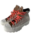 Stylish and functional high-top sneakers featuring a unique patterned design with contrasting red laces. Ideal for casual wear and outdoor activities. • High-top design for ankle support • Durable rubber sole for all terrains • Eye-catching patterned canvas exterior • Faux leather accents for a refined look • Lace-up closure with red laces Minor scuffing on soles. Top to bottom = 5.5 inches Heel to toe = 9.5 inches