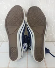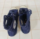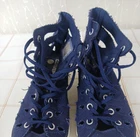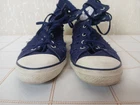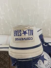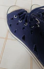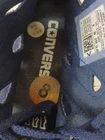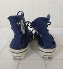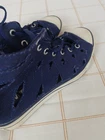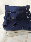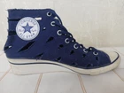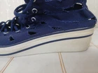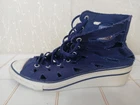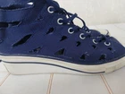 The product is a customized pair of Converse All Star high heel sneakers in size 8 for women. These blue sneakers feature cut outs and are made of canvas with a standard shoe width. The stylish and popular Converse Chuck Taylor All Star product line is known for its comfort and durability, making these sneakers a fashionable and practical choice for any wardrobe. Made with no tongue and cut out style for a cool feel and look. Normal wear. The Converse and laces are in good condition.