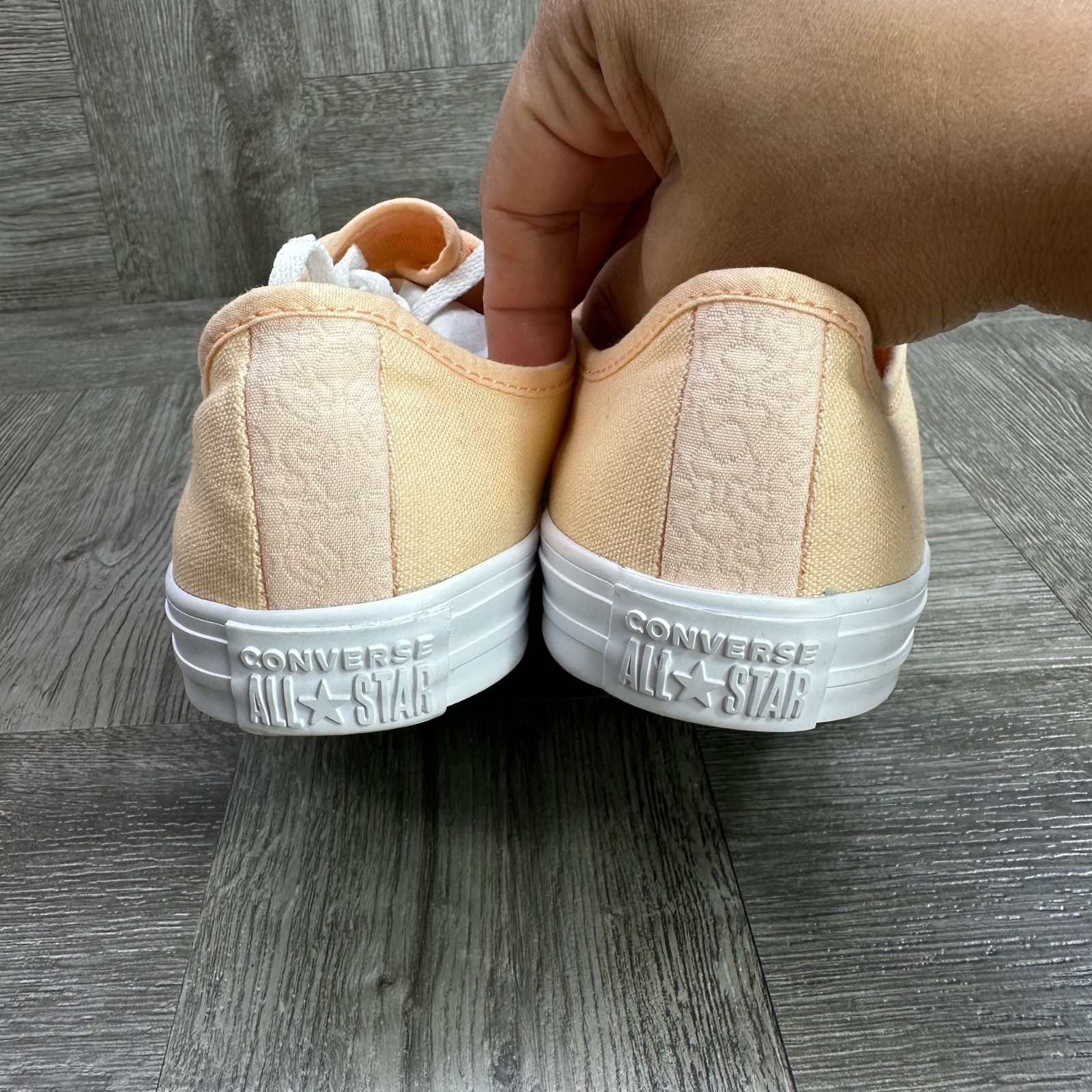 The Converse All Star Women's size 10 Peach Canvas Casual Shoes are a stylish and comfortable pair of sneakers perfect for casual occasions. Made with canvas fabric and featuring a rubber outsole, these shoes offer a lightweight feel and are suitable for summer, fall, and spring seasons. The lace-up closure and low-top shoe shaft style provide a secure fit, while the foam insole ensures added comfort. The orange color and star-themed accents add a fun and trendy touch to the classic Converse All Star design.