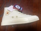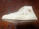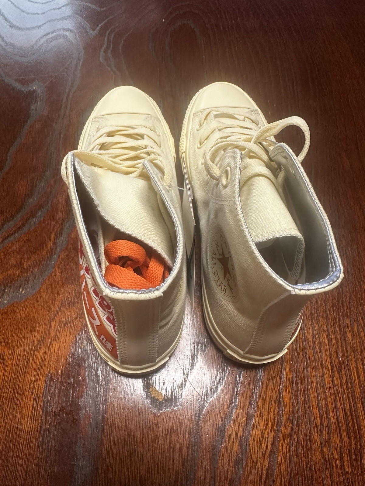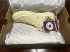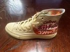 The Converse All Star Calbee Potato Chips 45th Limited Edition sneakers are a unique and collectors' item featuring a beige canvas upper with a high-top lace-up closure. These shoes have a standard shoe width and a rubber outsole, suitable for walking and casual occasions. Made in Vietnam in 2023, they showcase the iconic Converse brand and a star theme, making them a stylish and limited edition choice for both men and women. Converse and Calbee Potato Chips have teamed up! This is the Calbee 45th anniversary model!