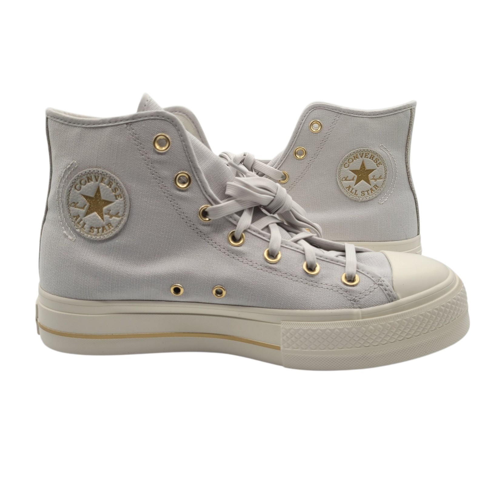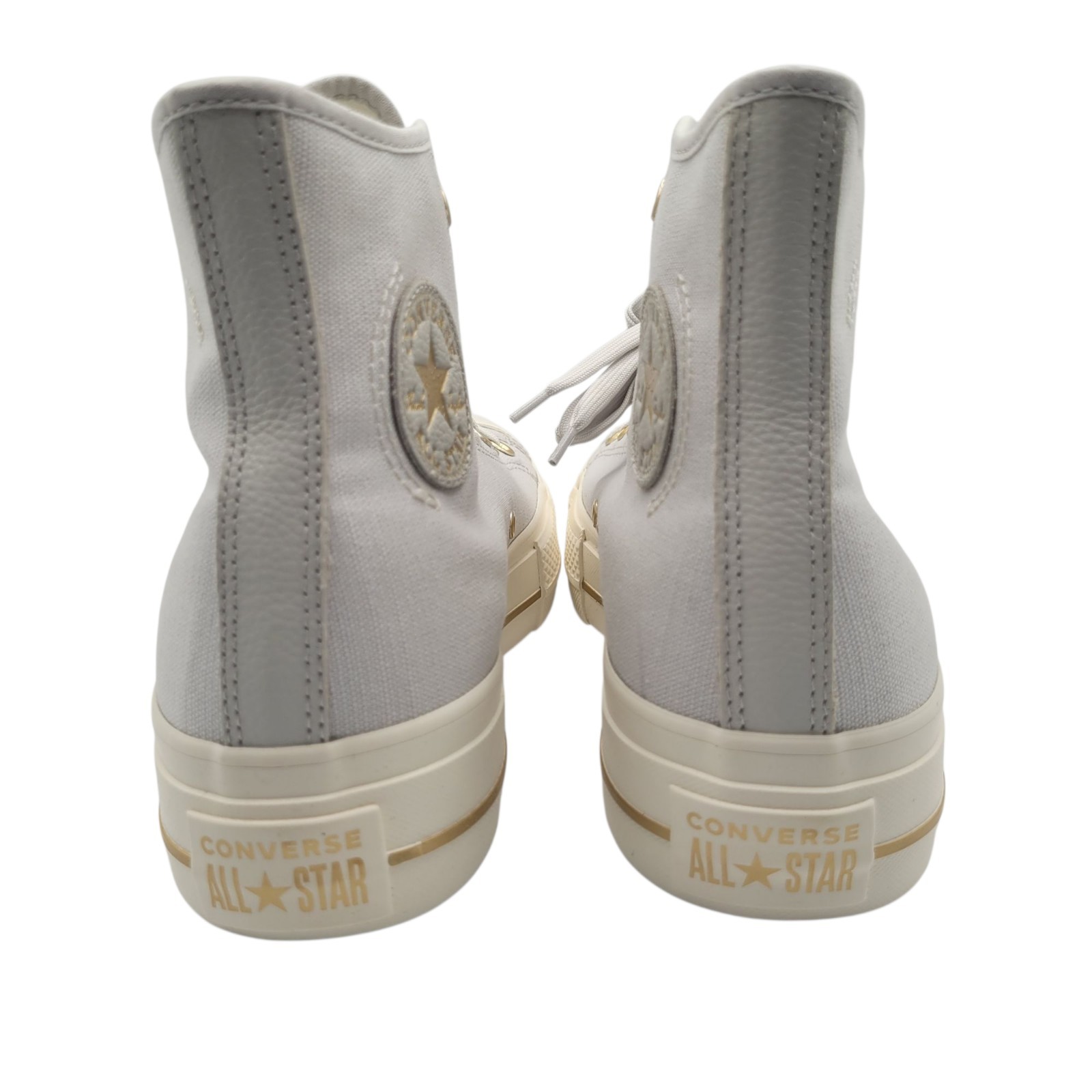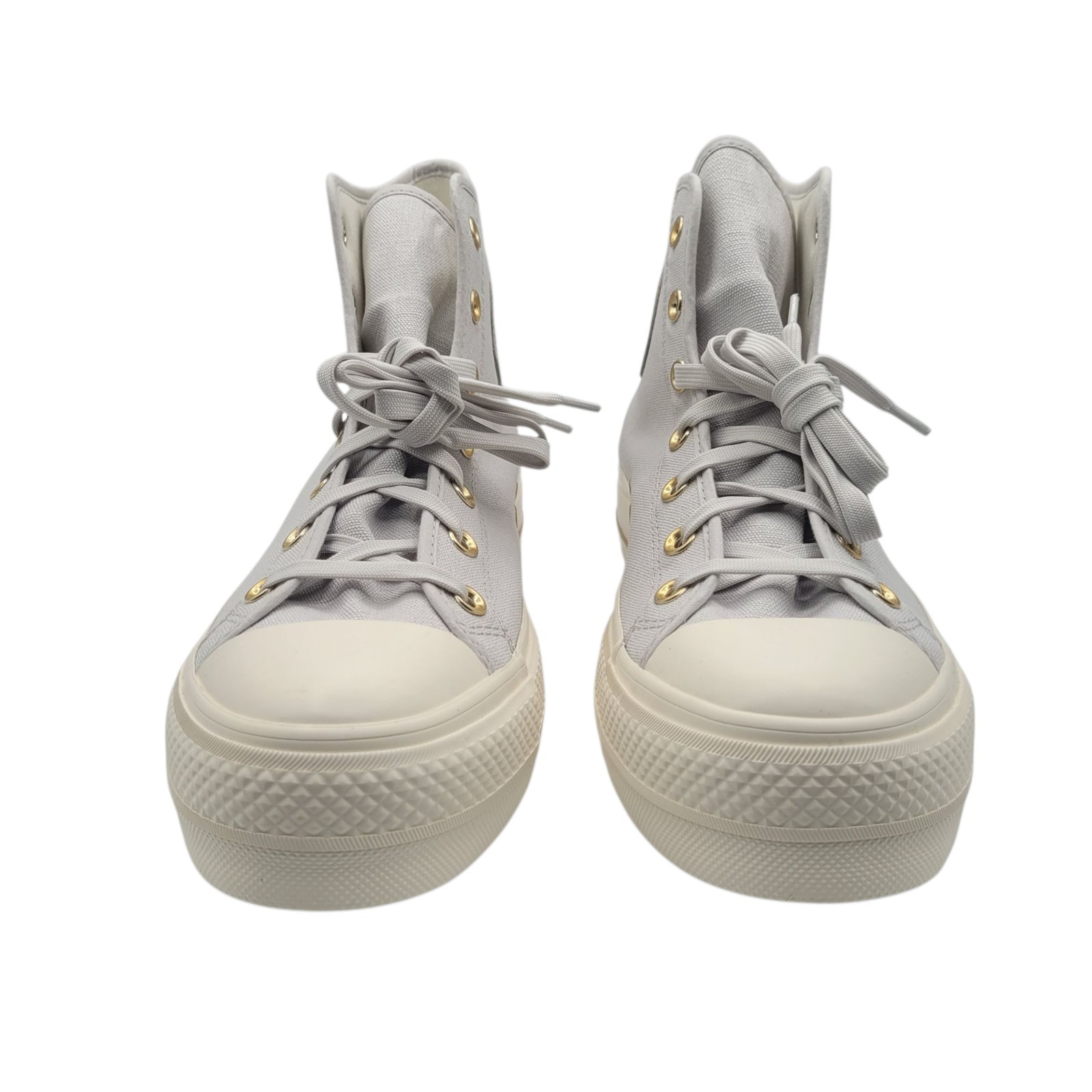 The Converse CTAS Lift Barely Grey/Egret Women's Platform High Top Sneakers in size 9 are a stylish and comfortable choice for casual wear. Made of canvas with a rubber outsole, these sneakers feature a lace-up closure and a high top shoe shaft style. The breathable and cushioned design with a foam insole offers comfort for all-day wear. With a solid pattern and accents of the Converse logo, these sneakers are versatile for all seasons and can be worn for activities such as gym training and school. Made in Vietnam under the Converse CTAS product line, these sneakers are a classic and trendy addition to any wardrobe.