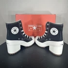 The Converse Chuck 70 De Luxe Heel Black M5/W7 Platform Sneakers A05347C Shoes are high-top platform sneakers designed for women in a classic black color. Featuring a lace-up closure and canvas fabric type, these athletic shoes by Converse offer a stylish and comfortable option for everyday wear. The Converse Chuck 70 model with its platform design provides a unique and trendy look, perfect for those looking to make a statement with their footwear choice.
