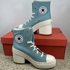 Elevate your sneaker game with these limited edition Converse Chuck 70 De Luxe high top sneakers in a stunning blue color. Designed for women with a US shoe size of 8.5, these shoes feature a canvas upper material and lining, with a rubber outsole for durable wear. They also come with a cushioned foam insole and adjustable lace-up closure for maximum comfort and support. The Converse Chuck 70 De Luxe Infinity Pool Blue High Top Heel Sneakers are perfect for any occasion, whether you're walking, dancing, or simply lounging around. Their high top silhouette and classic Converse CHUCK 70 De Luxe design make them a timeless addition to any wardrobe. Don't miss your chance to own this unique and stylish pair of sneakers.