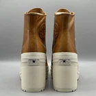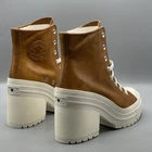 The Converse Chuck 70 De Luxe Heel (A12866C) reimagines the iconic Chuck with bold elevation and high-fashion energy. This women’s high-top sneaker boot features a rich cognac leather upper, a sculpted block heel, and a chunky platform sole that adds nearly 3 inches of height combined. Signature details like the rubber toe cap and star ankle patch ground the look in Converse heritage, while the sleek finish and lifted silhouette deliver a confident, runway-inspired statement. Originally retailed at $120.00 US Women's 8.5, UK 6.5 & EUR 39.5 - Manufacturers color : Cognac / Egret / Warm Tan. NEW - Tried on but never worn. Shoes are free from any defects or flaws. Original box is not included - shoes will ship in a generic box to ensure safe delivery to you. Please review all photos - I strive to show all angles, aspects, features and issues so you can buy with confidence. Packed carefully and Shipped fast. I do ship everyday so you can expect to receive these quickly.