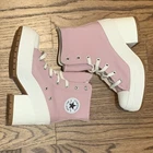 Elevate your sneaker game with these limited edition Converse Chuck 70 De Luxe Heel Static Pink High Heel Shoes. The shoes feature a solid pattern with colorful stars and accents of lace and logo. The high-top shoe shaft style and rubber cleat type provide support and durability, making them perfect for walking or school activities. These shoes are made with synthetic upper material and breathable features, ensuring comfort for casual occasions in the summer, fall, or spring. The shoes are available in women's US shoe size 6 and UK shoe size 4, with an EU shoe size of 36.5. The Converse Chuck Taylor All Star product line offers a stylish and functional shoe perfect for any wardrobe.