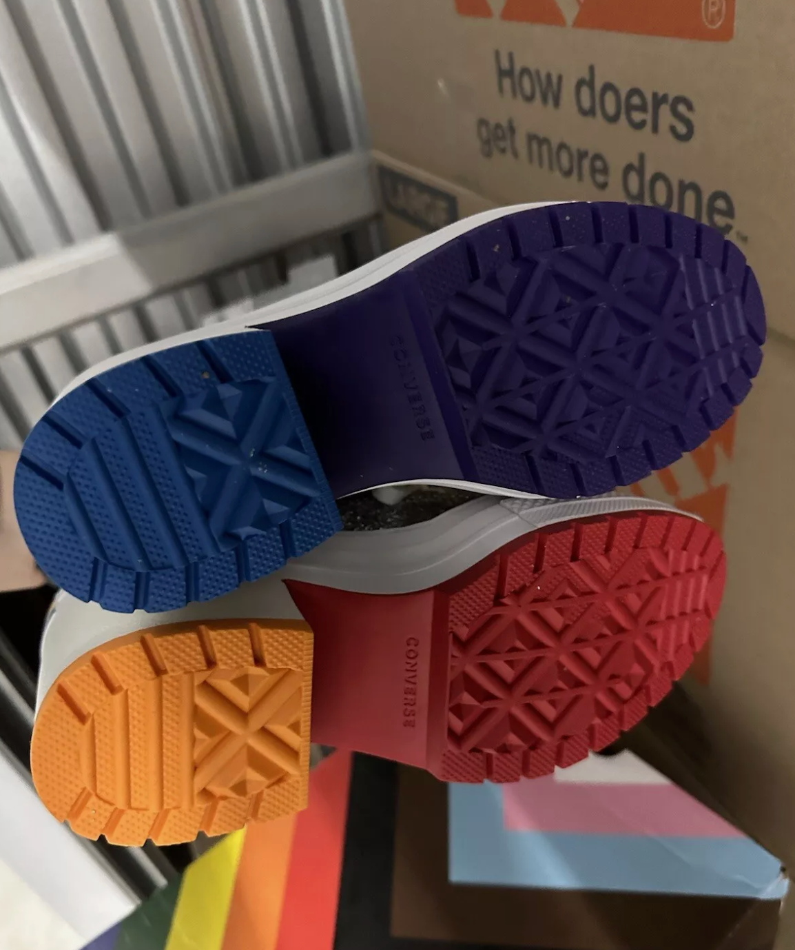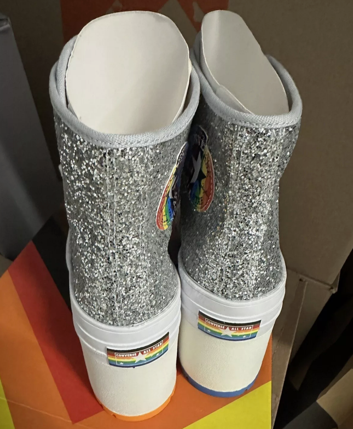 ITEM : Converse Chuck 70 De Luxe Heel Pride Platform Boot Silver CONDITION: BRAND NEW 3.5 US Men / 5.5 US Women STYLE CODE: A06028C (please view all pictures above to judge for the condition) All items have been well preserved in a smoke-free and pets-free environment. Please be advised that the box may be damaged due to transit or storage, missing box lid, or replaced 100% AUTHENTIC AND SATISFACTION GUARANTEED! NO FAKES! We shop the stores for the best deals and pass the savings on to you!