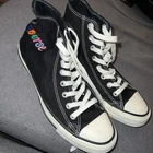 The Converse Chuck Taylor All Star Letter 165554C is a high-top sneaker with a classic black and rainbow accents, perfect for men size 7 and women size 9. This iconic model from Converse features the signature Chuck Taylor All Star style, making it a versatile and timeless athletic shoe. With its sleek design and comfortable fit, this sneaker is a must-have for those looking for a stylish and durable footwear option.