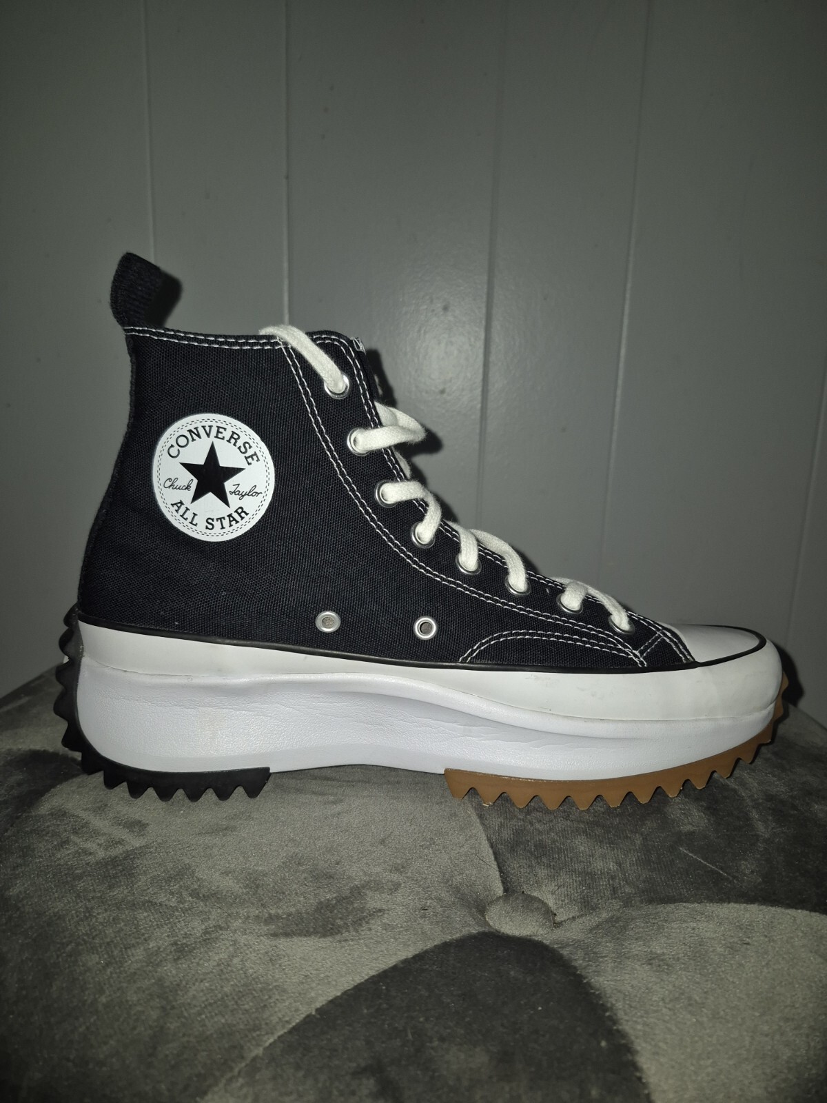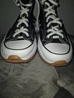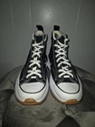 A chunky platform and jagged rubber sole put an unexpected twist on your everyday Chucks. Details like a canvas build, rubber toe cap, and Chuck Taylor ankle patch stay true to the original, while a molded platform, two-tone outsole, and rounded heel, give off futuristic vibes. Men's size 9 Women's size 10.5 WHY YOU SHOULD BE DOWN Canvas high-top platform sneakers. SmartFOAM sockliner for cushioning.