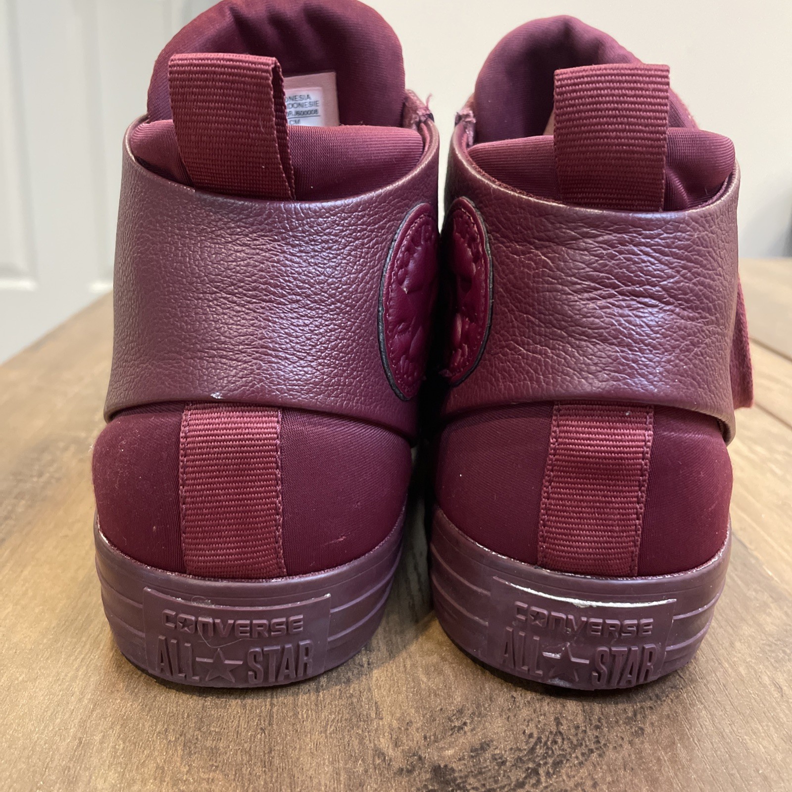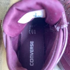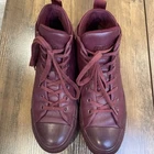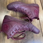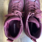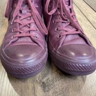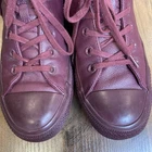 The product is a pair of Converse Chuck Taylor Hi Sloane monochrome red leather shoes for women in size 8.5 (UK 6.5, EU 39.5). These high-top sneakers feature a lace-up closure, red leather upper, and cushioned comfort. With a rubber outsole, they are suitable for activewear and casual occasions, and can be used for walking or basketball. The shoes are branded with Converse Chuck Taylor All Star Leather and have a solid pattern with colored sole and eyelet accents. Condition: pre-used - Good See close up photos for any scuffs, stains, flaws, and/or wear that may be on the item. All items are washed and/or sanitized, and shipped from a smoke free, pet-friendly home.