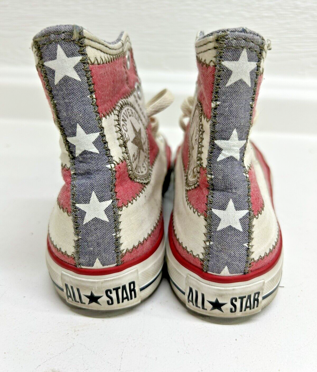 These Converse Chuck Taylor High Tops feature a stylish stars and stripes pattern on a multicolor canvas upper. The shoes have a high top shoe shaft style with lace-up closure and a comfortable fabric insole. The outsole is made of durable rubber and the shoes are suitable for walking, school, skateboarding, activewear, casual wear, and workwear. These unisex adult sneakers from Converse's Chuck Taylor product line do not disappoint. They are perfect for all seasons, including winter, summer, fall, and spring. Whether you want to make a fashion statement or need a reliable pair of athletic shoes, these shoes are a great choice.