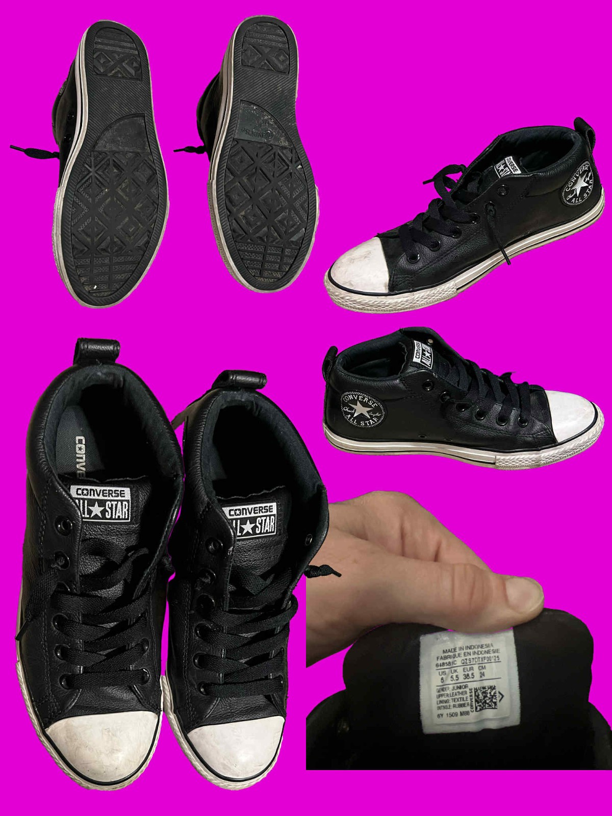 These Converse Chuck Taylor Mid sneakers are a fantastic find! The black leather looks sleek and holds up well, with only minor scuffing. Super comfortable for daily wear, and the tread is still solid. Love the classic design—goes with everything. Clean insides, no funky smells, and shipped super fast. Perfect for anyone wanting that timeless Converse vibe without breaking the bank. Highly recommend!