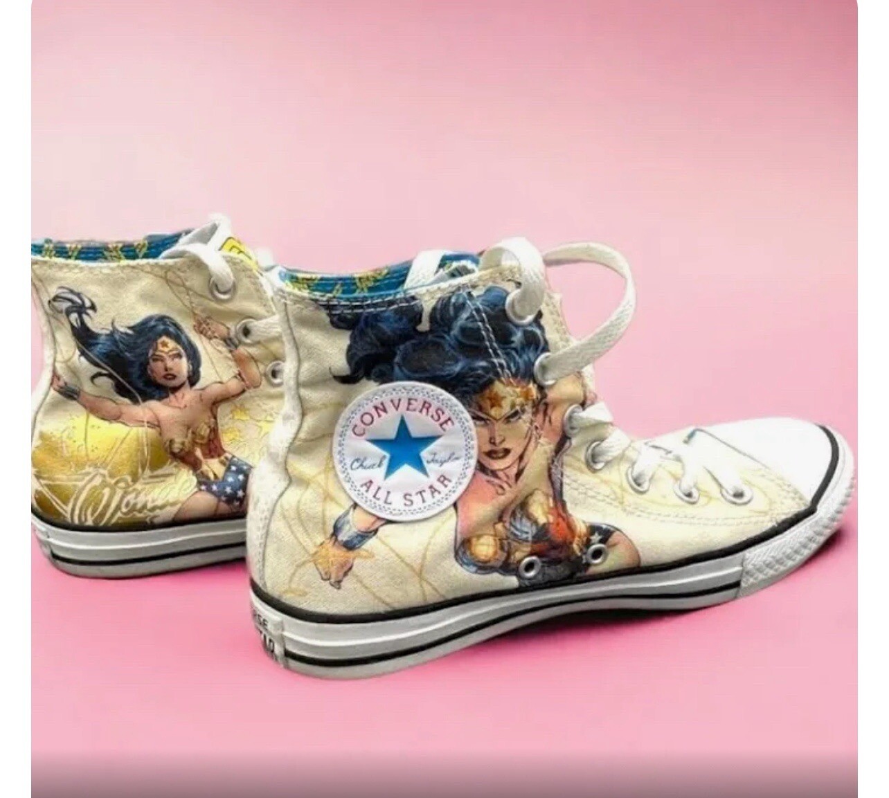 Worn once these are custom Wonder Woman converse selling for over $350 size 6 woman’s. Chuck Taylor design and super metallic gold colors that pop right off the shoes. Perfect for any occasion when you want to be comfy and still stylish.