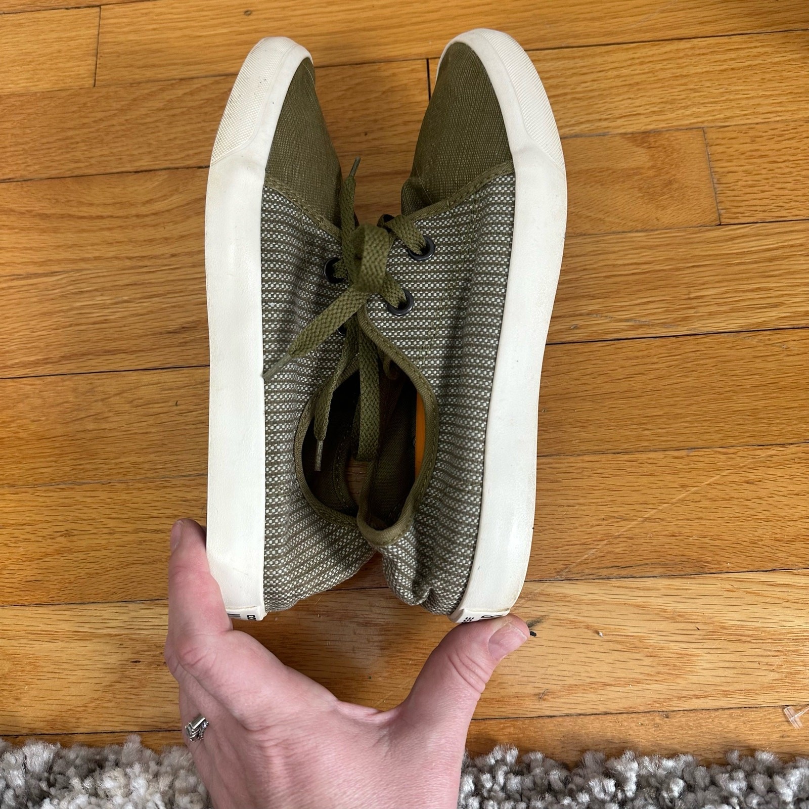 Converse Olive Green White Stripe Low Top Sneakers Shoes Men's 7 Women's 8.5 Great condition, barely worn. See photos. Rare, unique style! Men's size 7, women's size 8.5