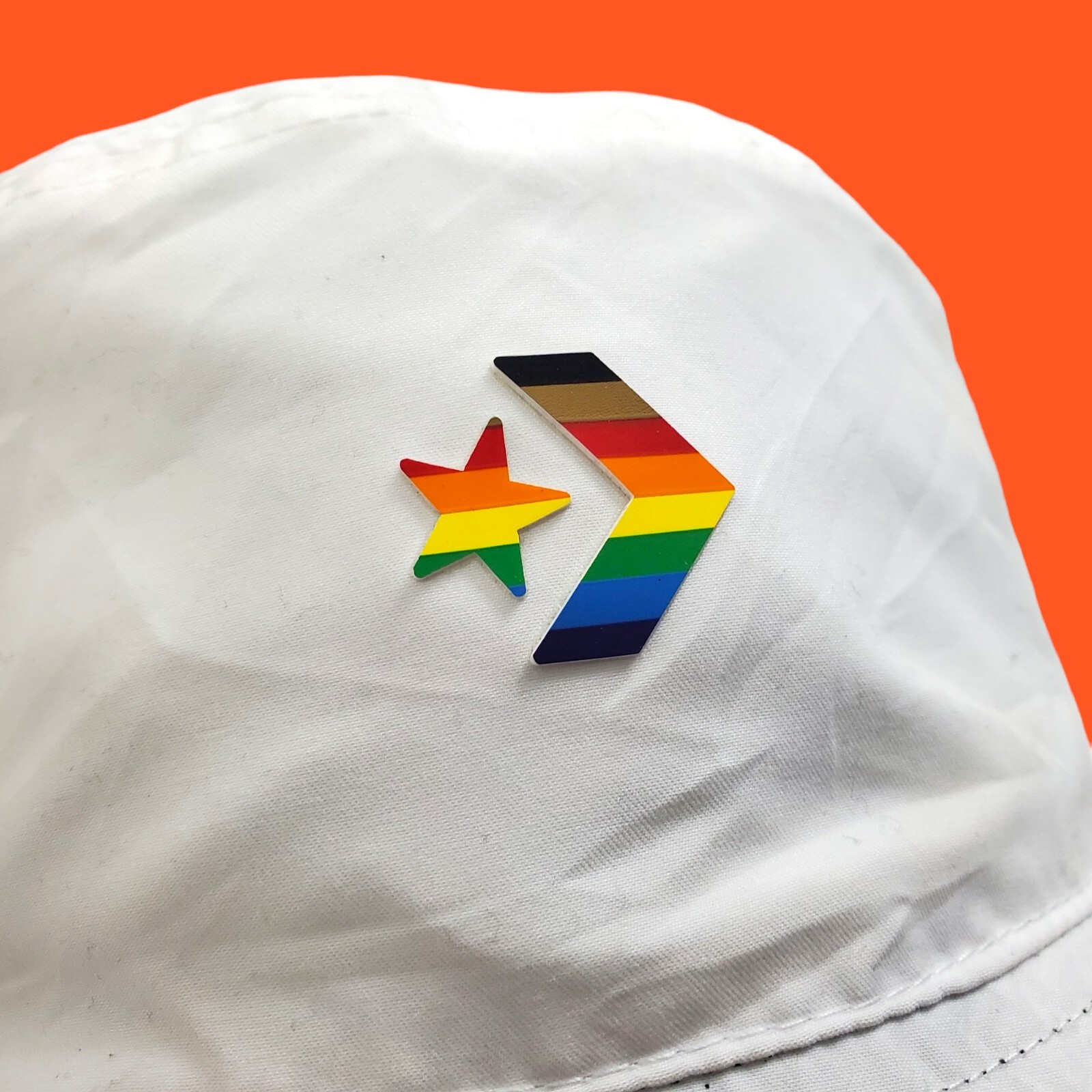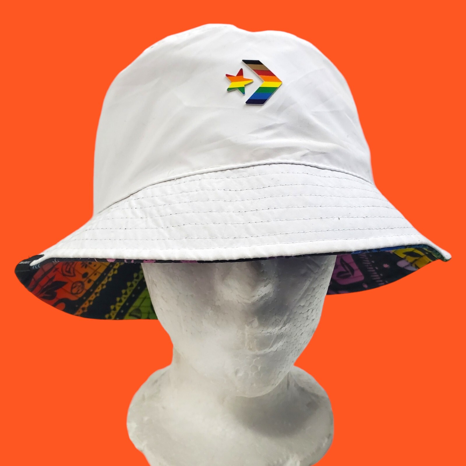 Show off your pride with this colorful and reversible Converse bucket hat. The floral and paisley pattern in shades of blue, white, and rainbow make it a perfect accessory for any casual occasion. Made of durable polyester and canvas fabric, this hat is perfect for summer, fall, and spring seasons. This unisex adult hat is one size fits all and features a Converse brand logo. It is not signed or personalized, but it is a great addition to any collection. Made in Vietnam, this hat is not vintage and is perfect for anyone who loves fashion and pride.