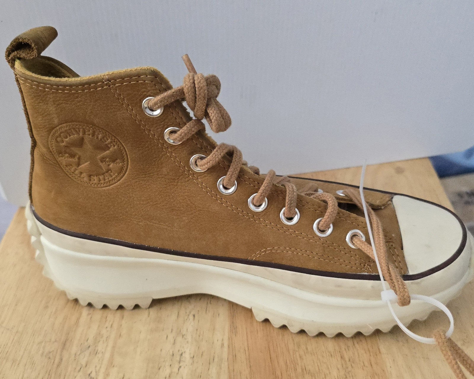 The Converse Run Star Hike Platform High Top Wheat Leather Sneakers 171666C in men's size 8/womens 9.5 are a stylish and durable athletic shoe designed for men. With a high top shoe shaft style and leather upper material, these sneakers offer a trendy yet functional option for hiking and outdoor activities. The brown color and star theme add a fashionable touch to this Converse model released in 2021, making it a versatile choice for everyday wear or adventurous pursuits.