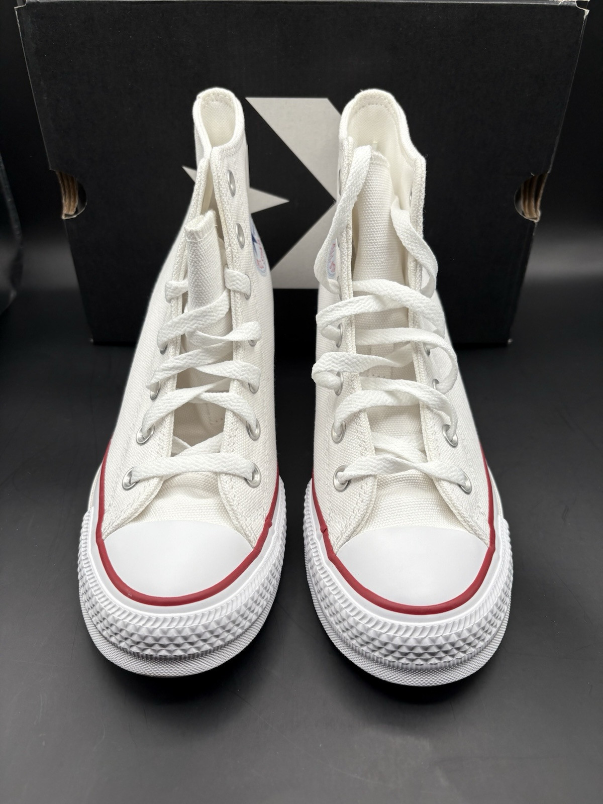 Shoes got here in great condition. They look great right from our the box. I'm happy with the purchase. Seller packaged everything intact and relatively fast.