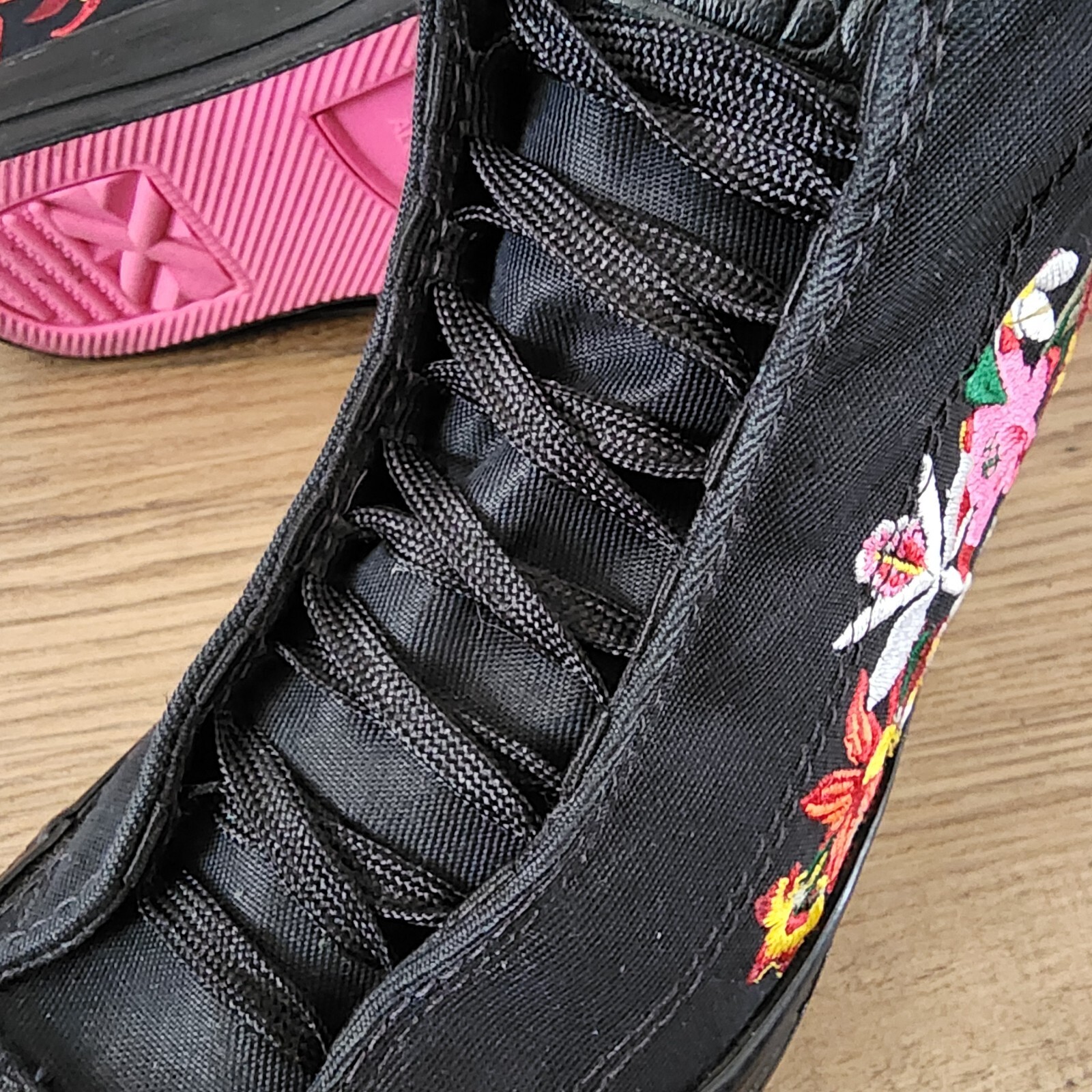 Converse Chuck Taylor All Star PatBo Limited Edition Collaboration. Black Embroidered Floral Design 3" Hidden Wedge Sneakers Platform Height = 1.25" Women's Size 6.5 Canvas 554865C Shipping Weight = 2 lbs. In very good preowned condition. Please view all photos as they are of the actual item, part of description and to judge condition for yourself. Shipping: Normally shipped within 24 hours from receipt of payment on regular business days.