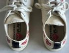 The Converse x Comme Des Garçons Play sneakers for men and women feature a white canvas upper with multiheart accents, perfect for casual and activewear occasions. Released in 2019, these limited edition sneakers are cushioned for comfort and feature a rubber outsole. With a low top design and lace-up closure, these sneakers are ideal for walking, school, or basketball. Show off your style with the happy heart and star-themed design, making them a standout addition to your shoe collection. These Sneakers are in Very Good Condition with very little wear to the soles. There are a couple tiny scuff marks in toe areas. Overall great shape. See All Photos.