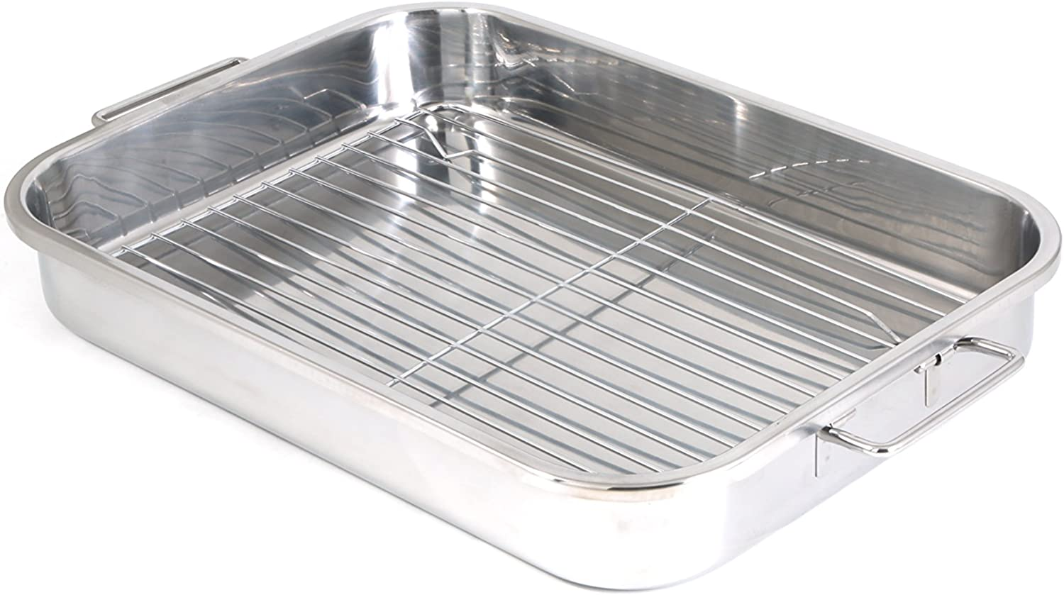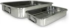 Constructed in durable stainless steel, these two pans and roasting racks are differently-sized for your convenience Stainless handles that make placing lasagnas into the oven and lifting them out, safe and easy The stylish mirror polished exterior also makes this all-in-one piece a perfect serving dish Both pans measure to 12.5" x 9.5" x 2.25" and 16.5" x 12" x 2.5" A must-have in every home Constructed in durable stainless steel, these pans come in two popular sizes for your convenience. Just the right size for multi-layered lasagnas. Includes two chrome racks for your favorite roasts. Comes with stainless foldable handles that make lifting in and out of the oven safe and easy. The stylish mirror polished exterior also makes this "all in one" a perfect serving dish.