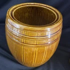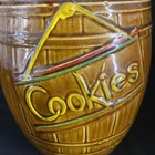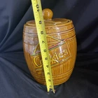 This vintage McCoy Ceramic Whiskey Barrel Cookie Jar is a must-have for collectors and enthusiasts alike. The jar features a solid pattern in brown color and is made of high-quality ceramic and porcelain materials. It comes with a lid that can be easily lifted off and has one compartment for storing your favorite cookies or other treats. The jar measures 6 inches in length and width and stands at 9 inches tall ( See Photos) , making it a medium-sized item that can fit on any kitchen shelf. Its cylinder shape and wooden barrel character add a touch of retro style to any food or kitchen-themed collection. This original, licensed reproduction cookie jar is a great addition to your vintage cookie jar set. No chips or cracks. In excellent condition.